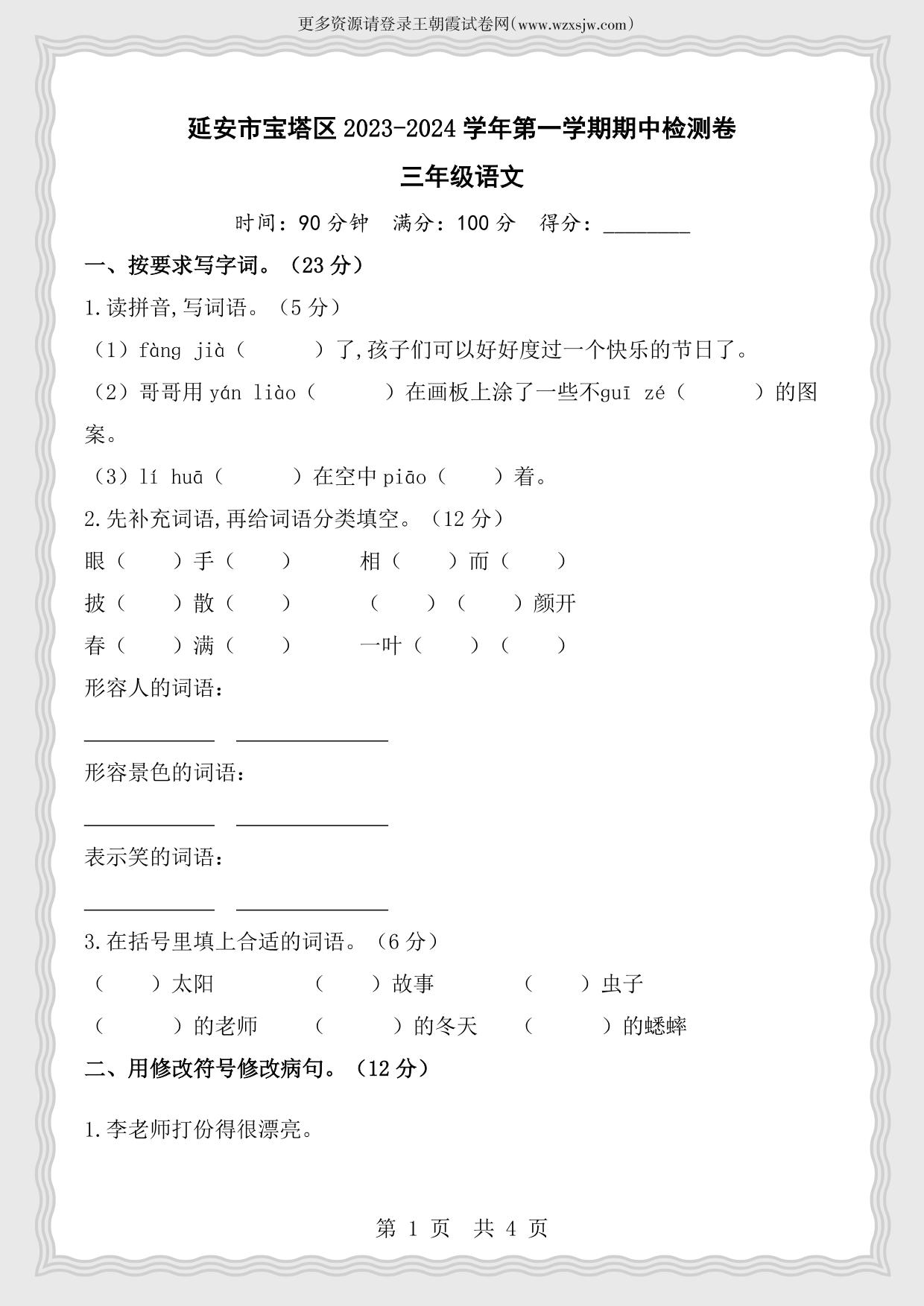 陕西省延安市宝塔区2023-2024学年第一学期期中检测卷三年级语文(人教版)