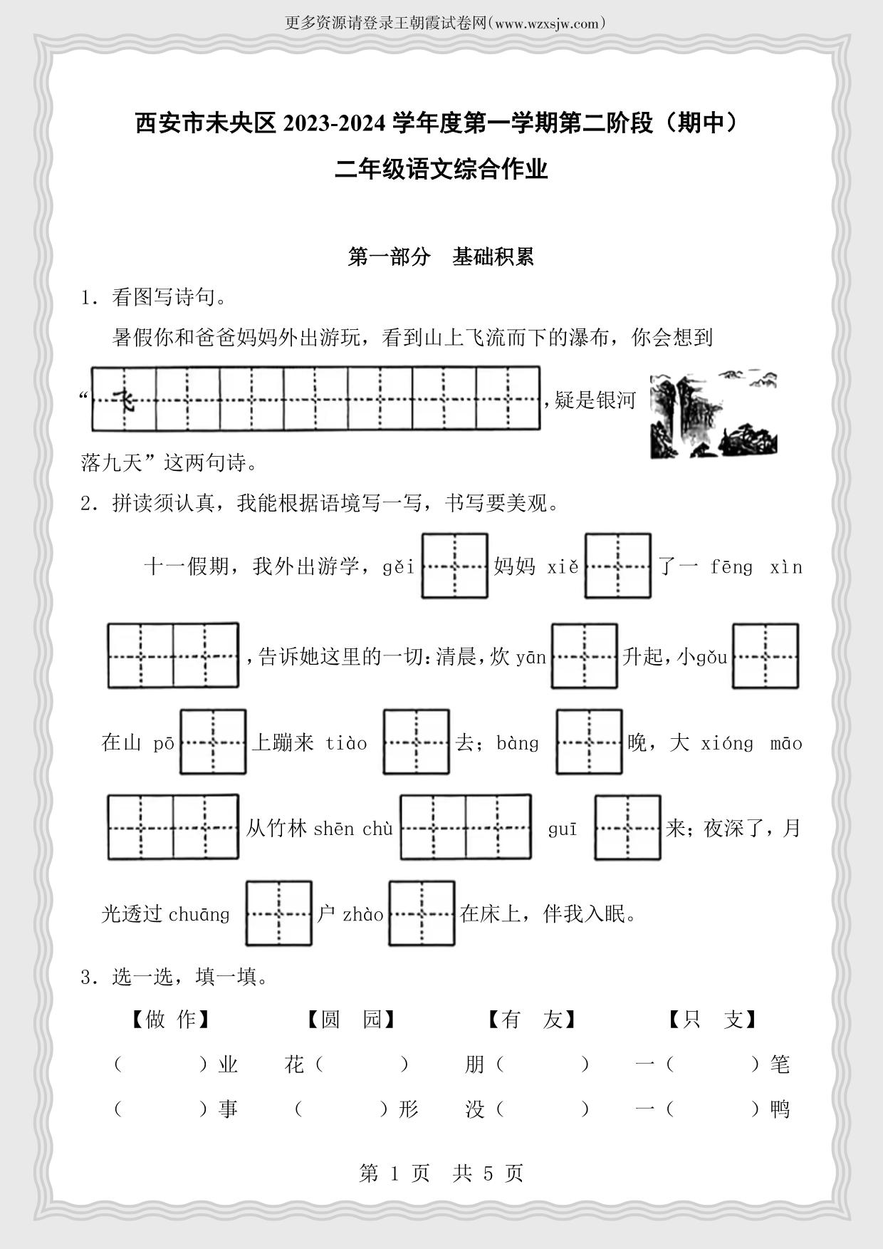 陕西省西安市未央区2023-2024学年度第一学期第二阶段(期中)综合作业二年级语文(人教版)