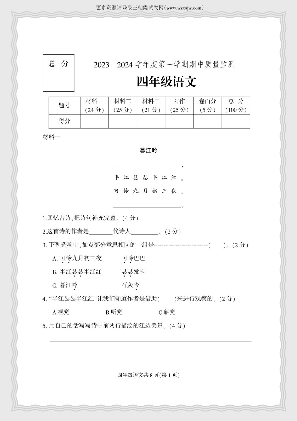 河北省保定市2023-2024学年度第一学期期中质量监测四年级语文(人教版)