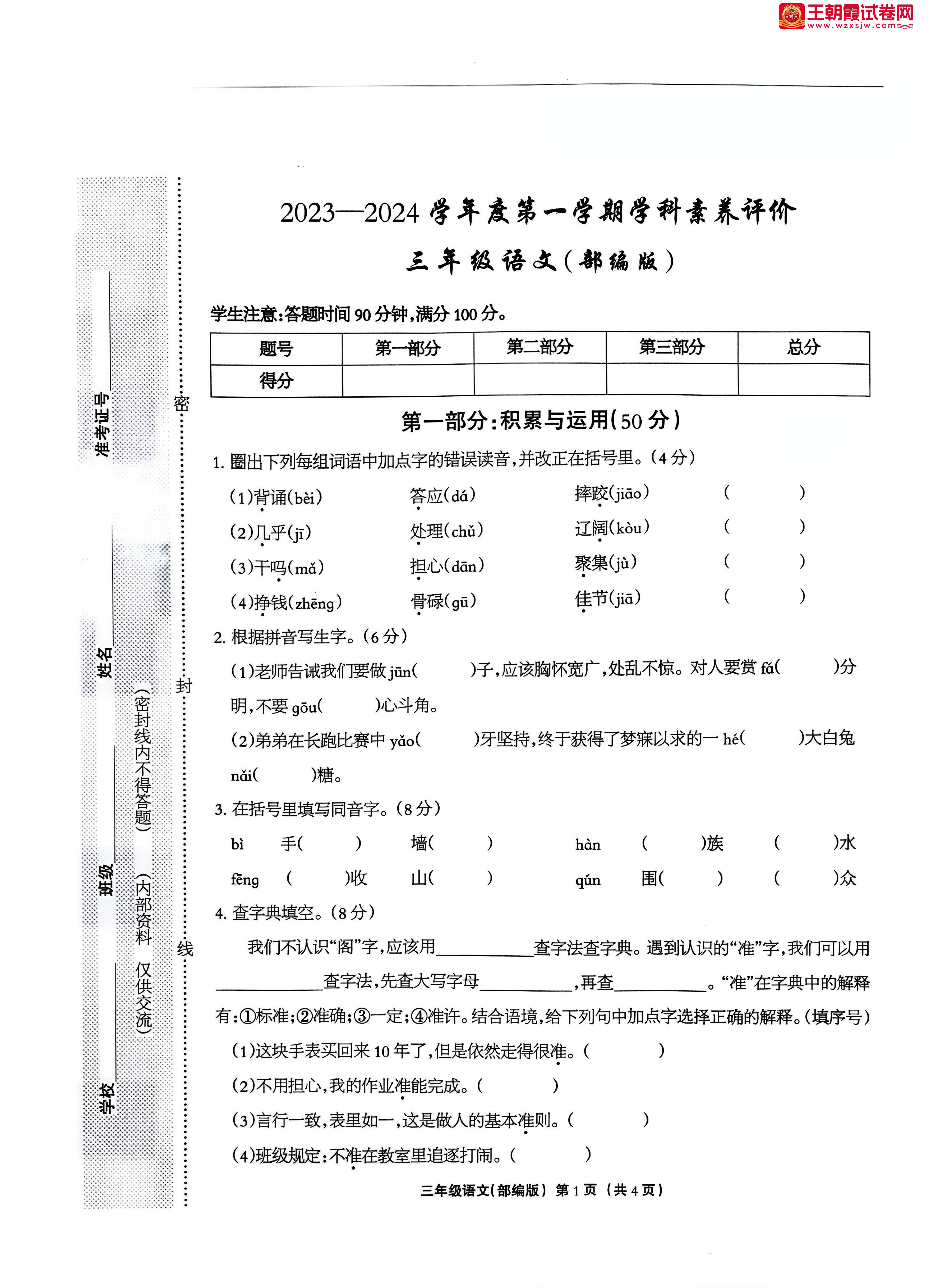 河北省保定市阜平县2023-2024学年度第一学期期中学科素养评价三年级语文(人教版)
