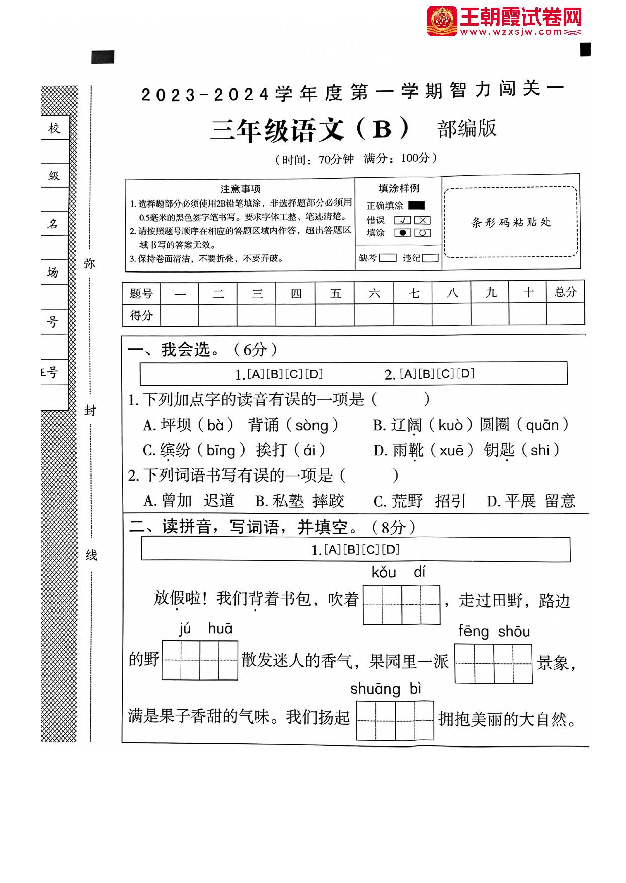 三年级语文人教版上册月考卷
