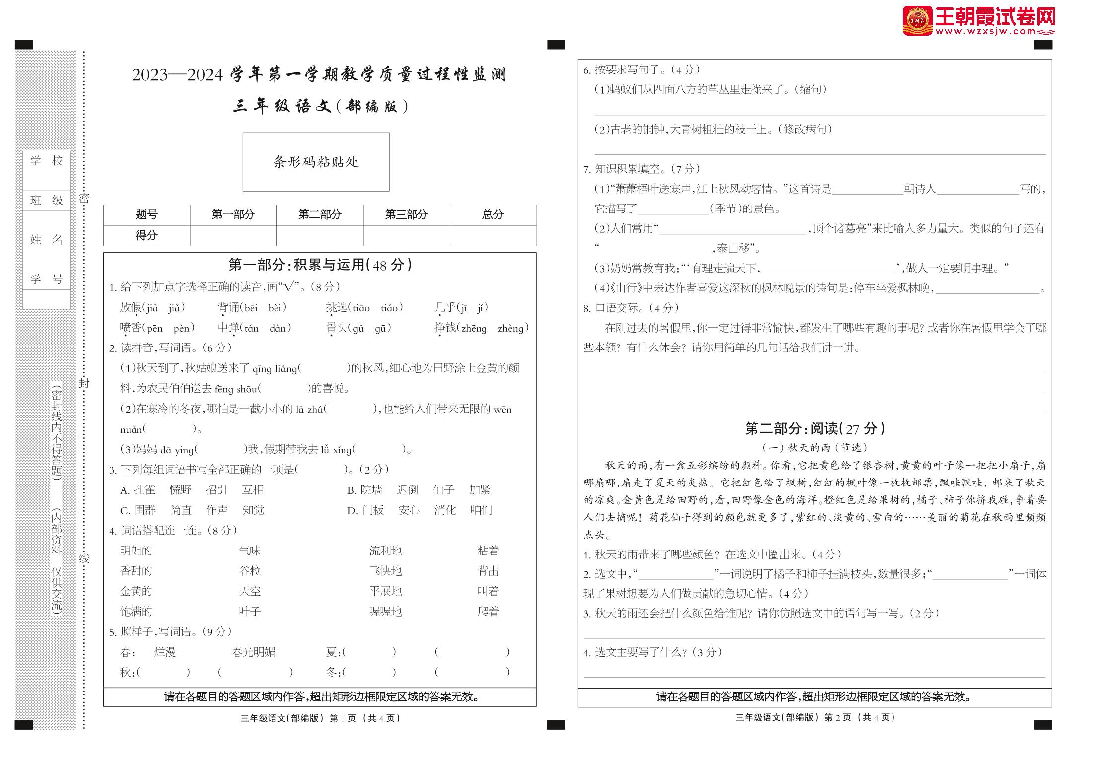 河北省保定市安新县2023-2024学年第一学期期中教学质量过程性监测三年级语文(人教版)