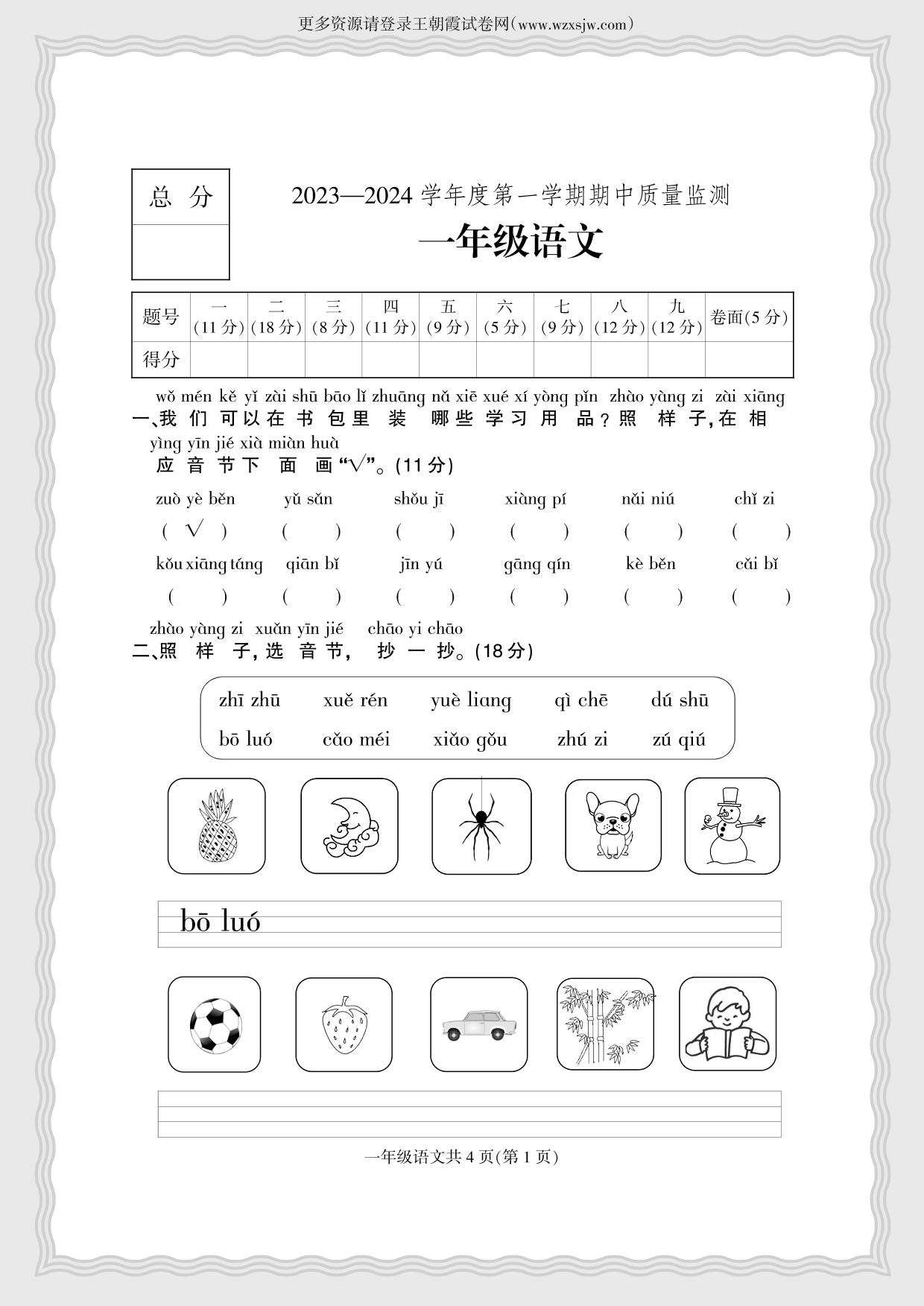 河北省保定市2023-2024学年度第一学期期中质量监测一年级语文(人教版)