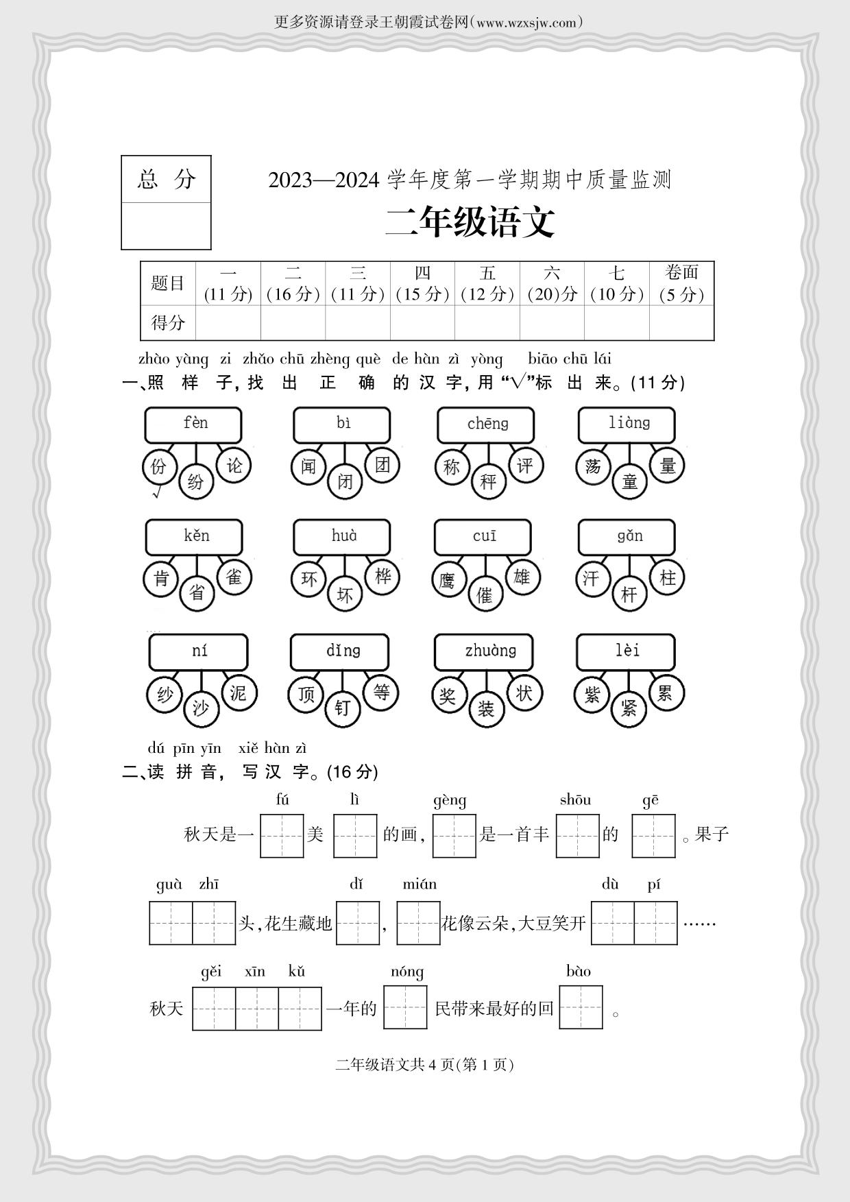 河北省保定市2023-2024学年度第一学期期中质量监测二年级语文(人教版)
