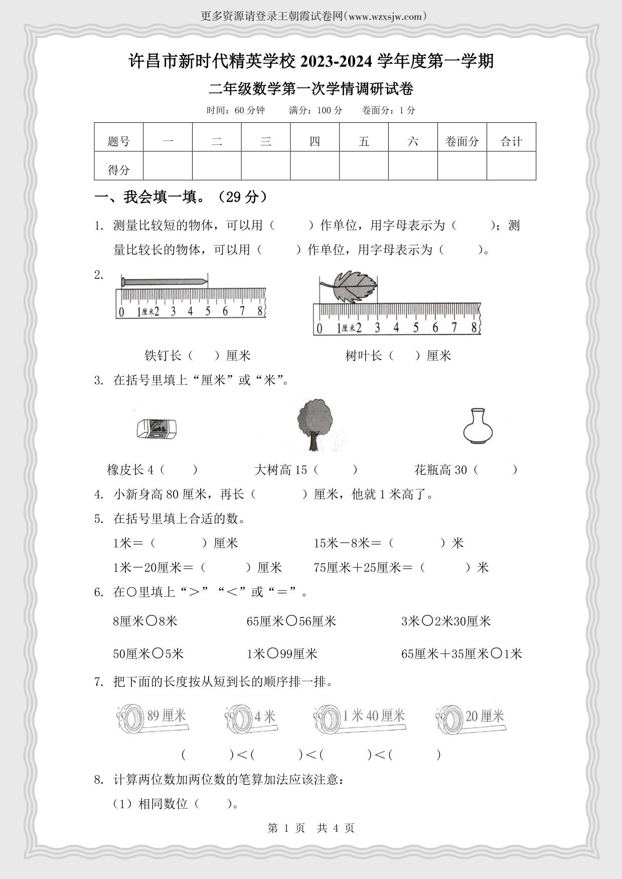 河南省许昌市东城区新时代精英学校2023-2024学年度上学期第一次学情调研月考试卷二年级数学(人教版)