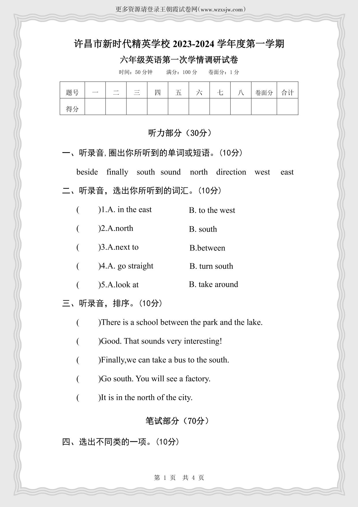 河南省许昌市东城区新时代精英学校2023-2024学年度上学期第一次学情调研月考试卷六年级英语(湘鲁版)