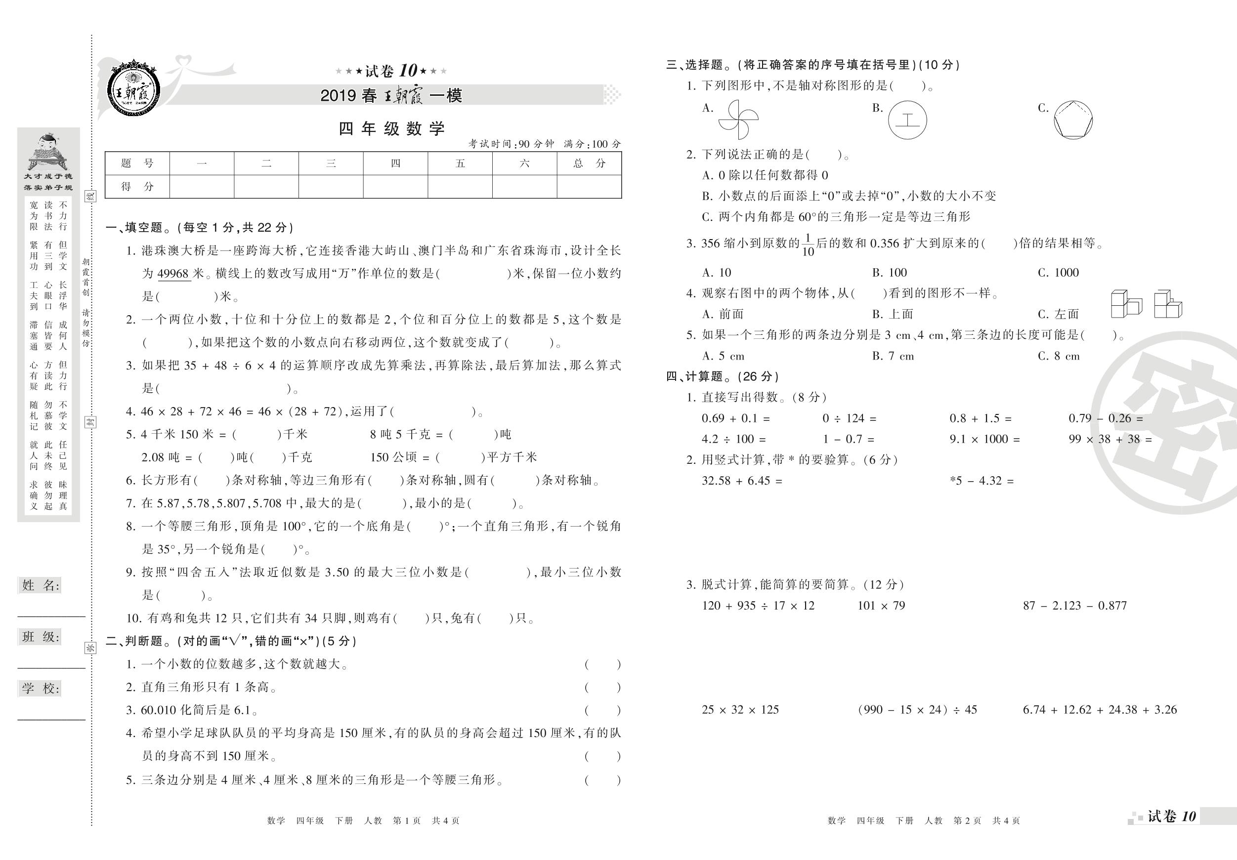 王朝霞期末模拟卷四年级下册数学(人教版)_R210804150653【10】