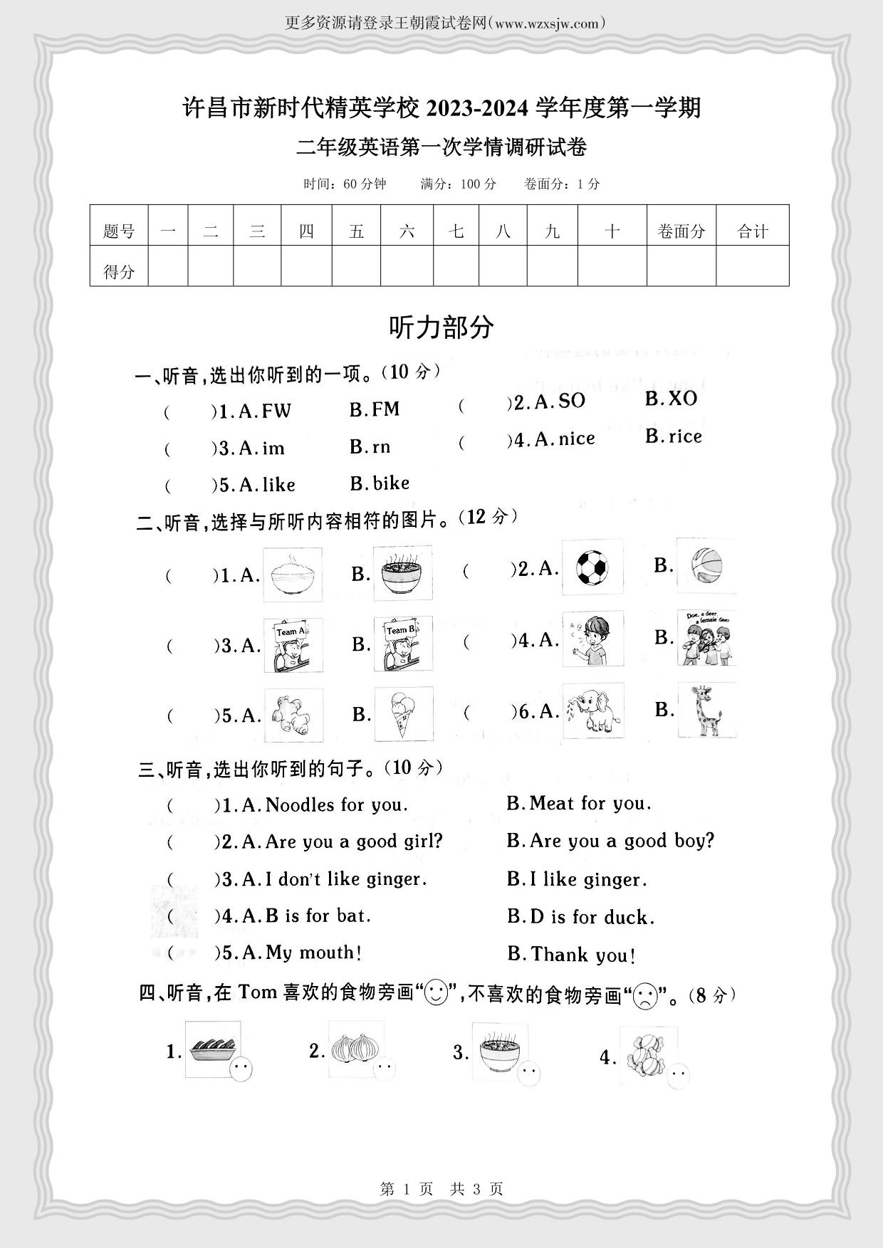 河南省许昌市东城区新时代精英学校2023-2024学年度上学期第一次学情调研月考试卷二年级英语(外研版·一起始)