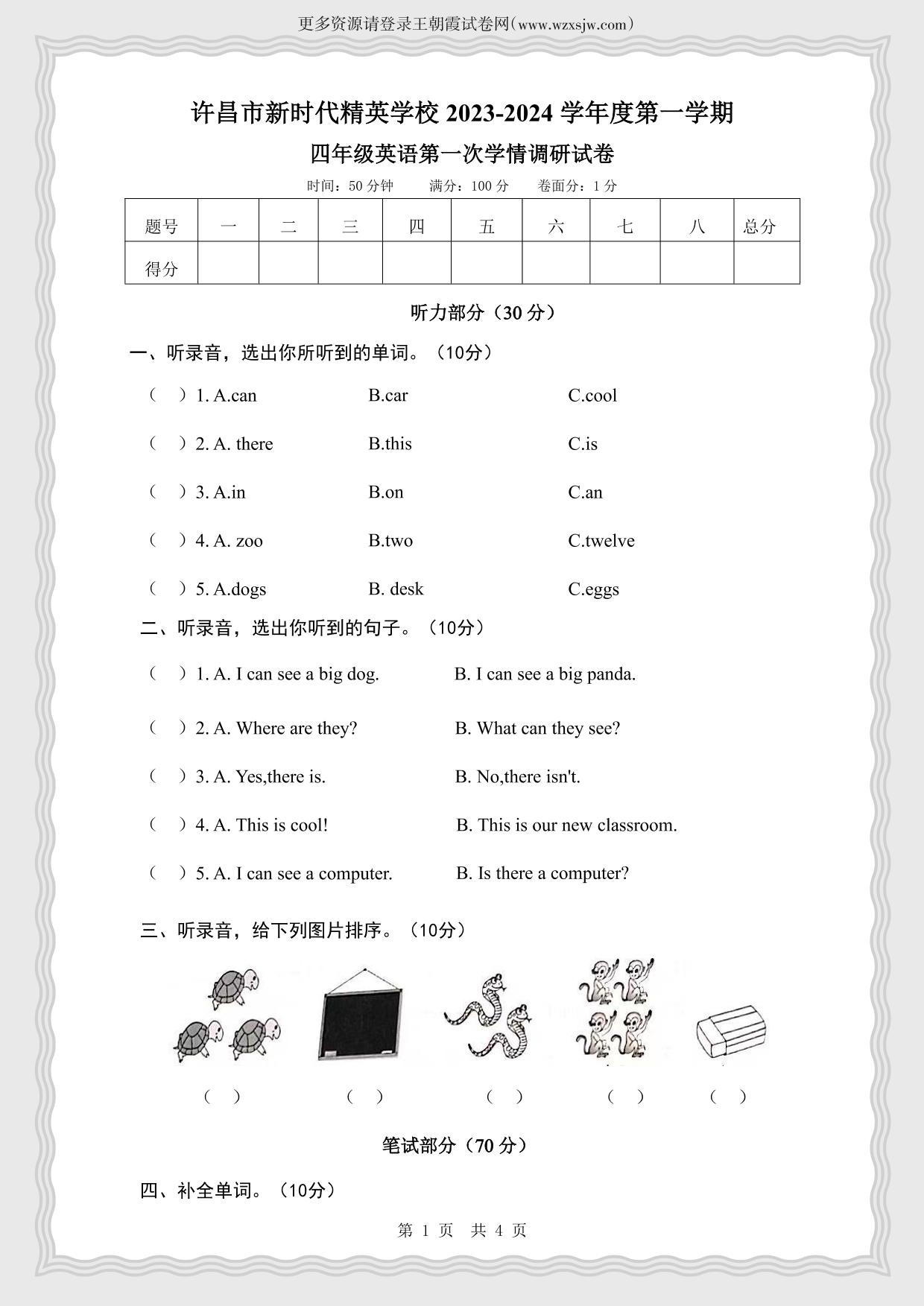 河南省许昌市东城区新时代精英学校2023-2024学年度上学期第一次学情调研月考试卷四年级英语(湘鲁版)