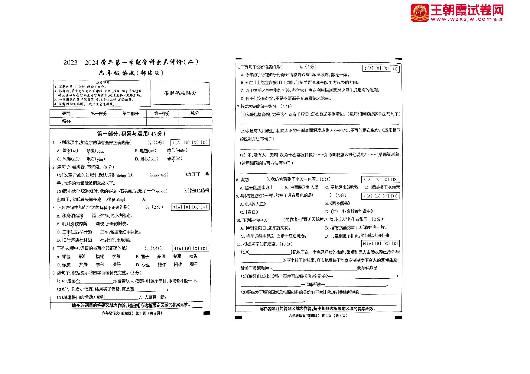 河北省保定市徐水区2023-2024学年第一学期期中学科素养评价六年级语文(人教版)
