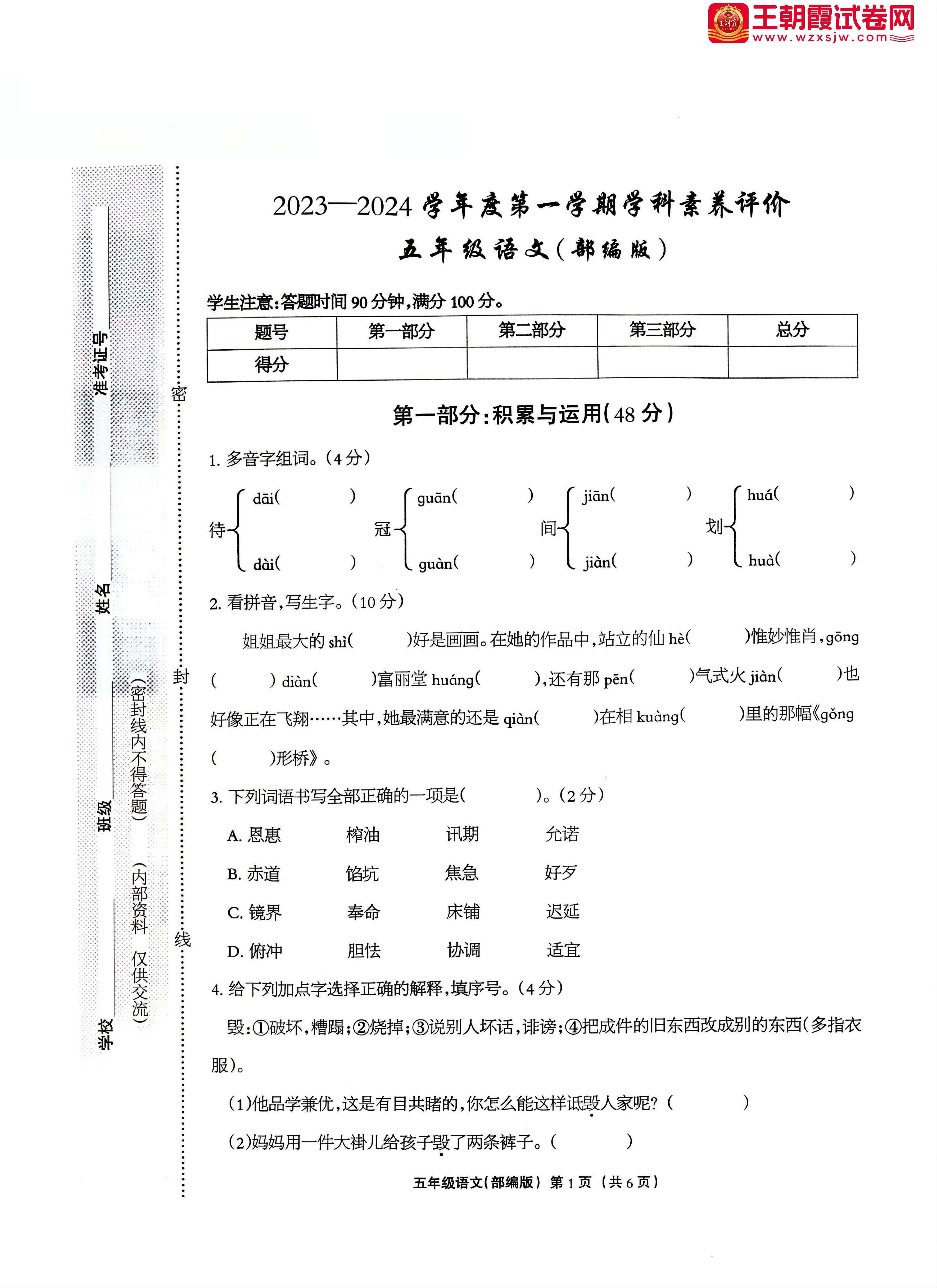 河北省保定市阜平县2023-2024学年度第一学期期中学科素养评价五年级语文(人教版)