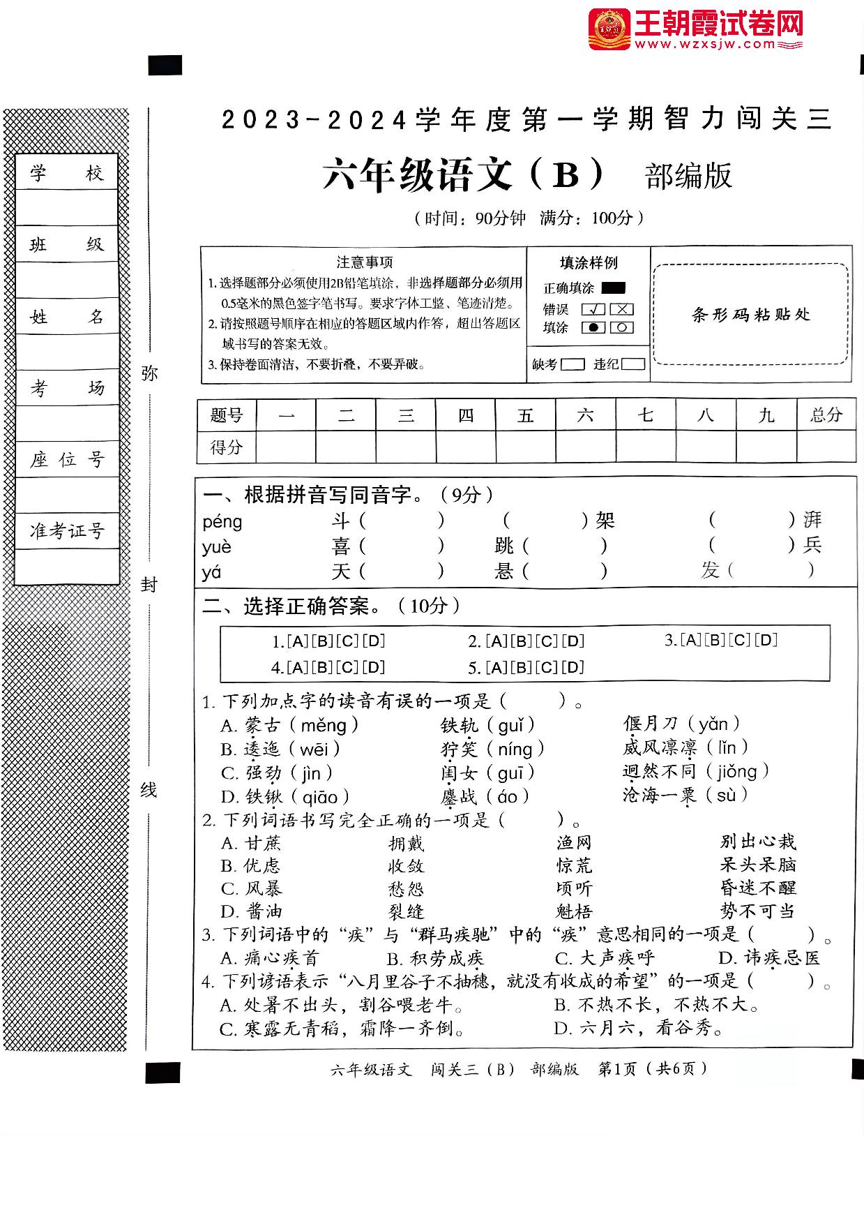 河北省邢台市威县第四小学2023-2024学年第一学期第三次月考六年级语文(人教版)