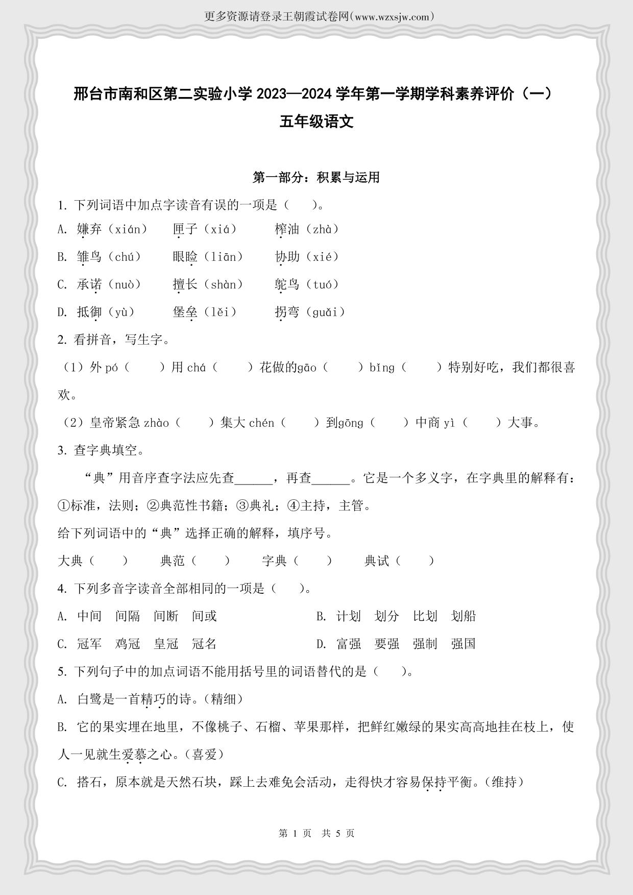 河北省邢台市南和区第二实验小学2023-2024学年第一学期第一次月考五年级语文(人教版)