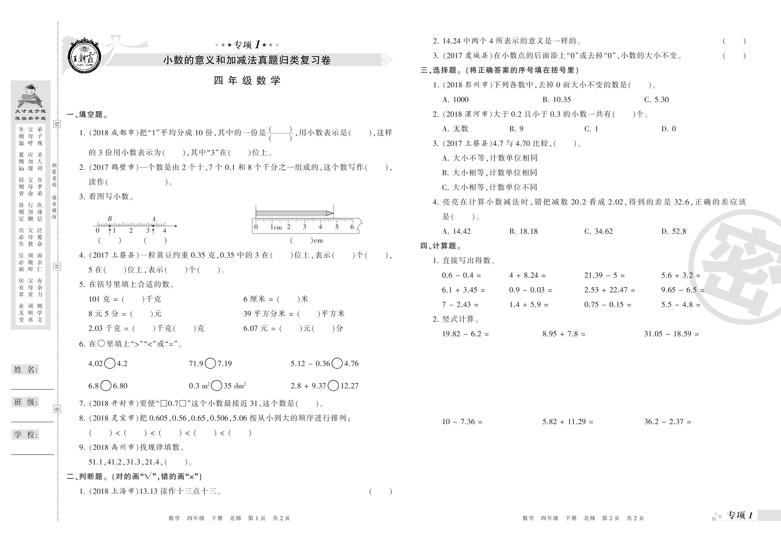 王朝霞期末专项卷——小数的意义和加减法、认识三角形和四边形真题归类复习卷四年级下册数学(北师版)_R210804150702【0】