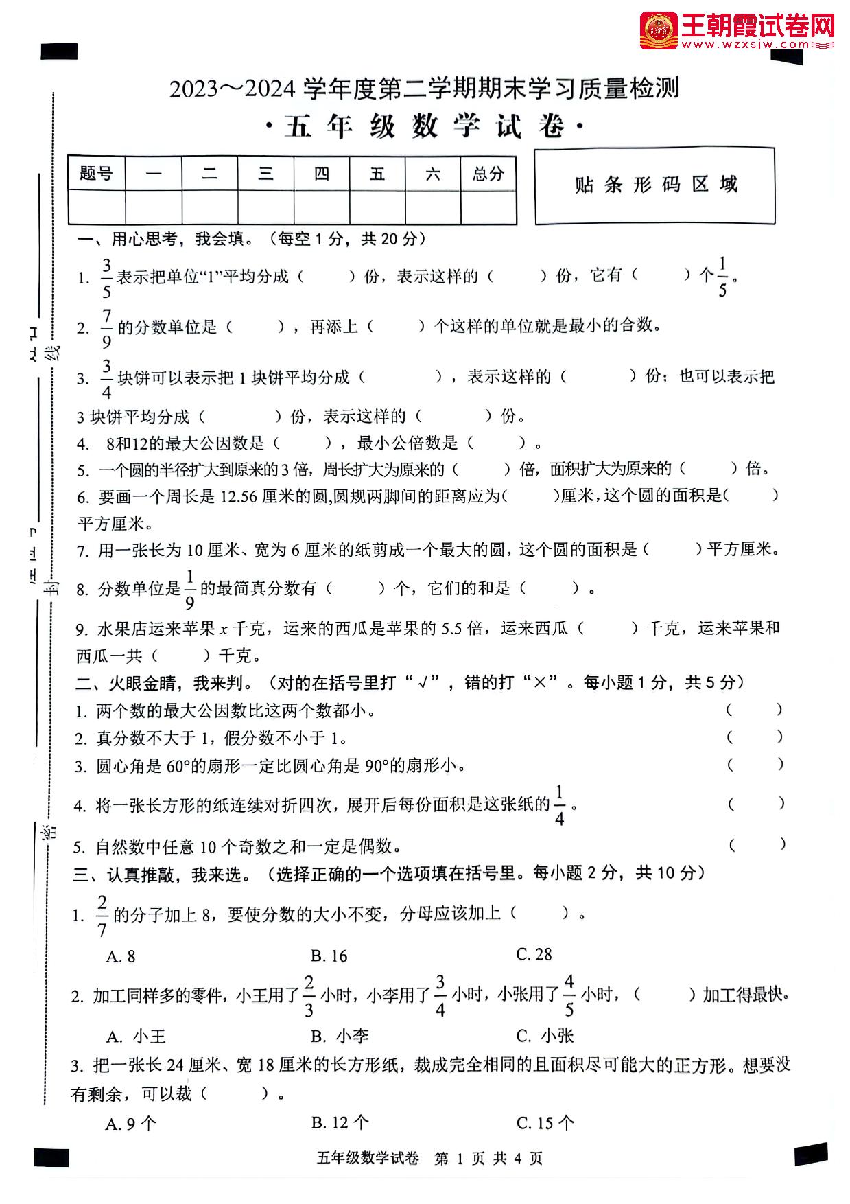安徽省芜湖市无为市2023-2024学年度第二学期期末学习质量检测五年级数学(苏教版)