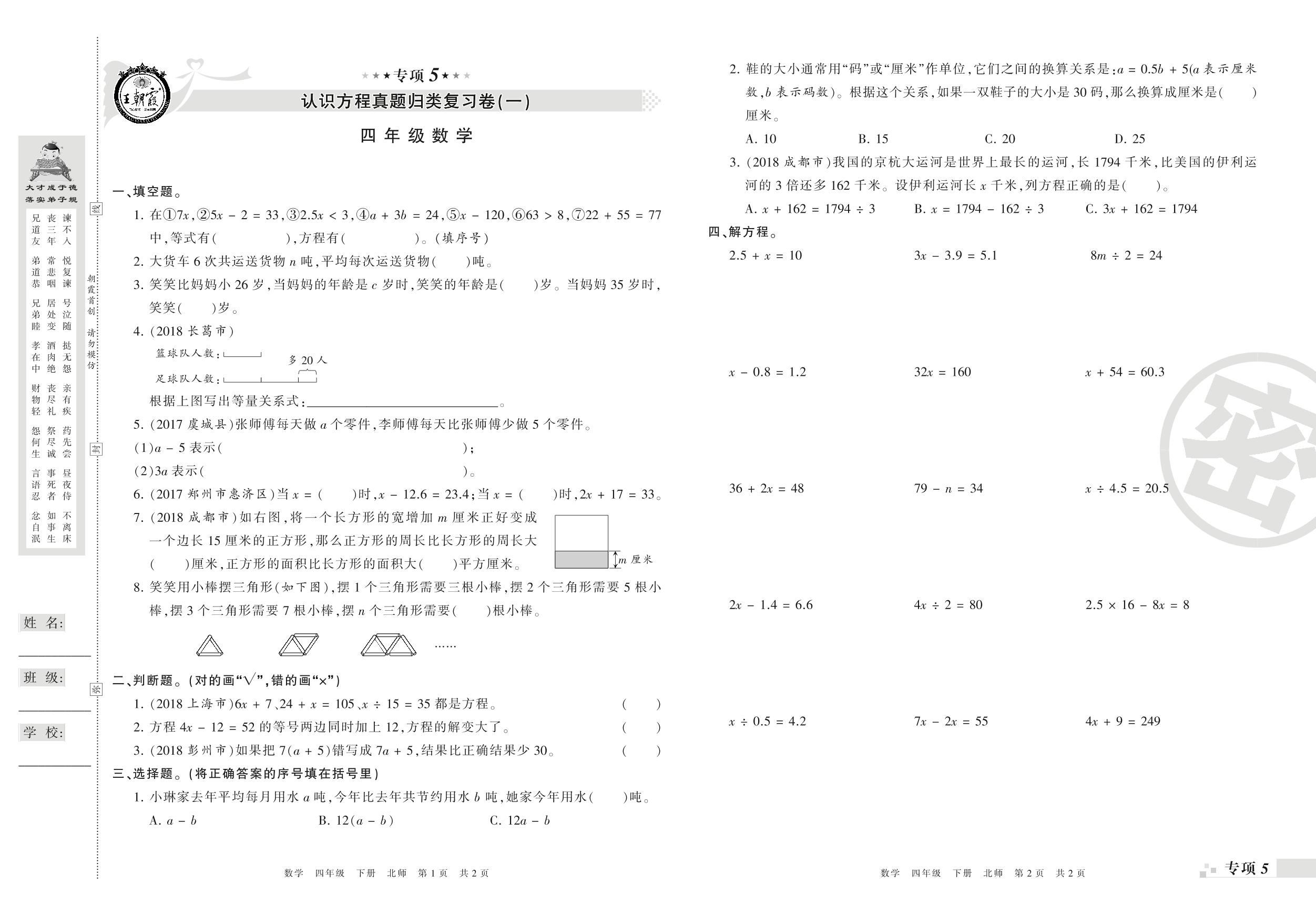 王朝霞期末专项卷——认识方程(一)(二)真题归类复习卷四年级下册数学(北师版)_R210804150709【0】