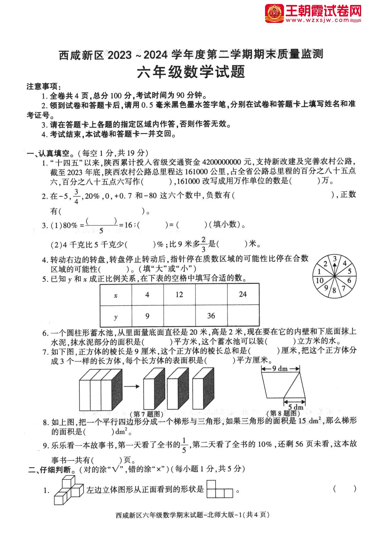 陕西省西安市西咸新区2023-2024学年度第二学期期末质量监测试题六年级数学(北师版)