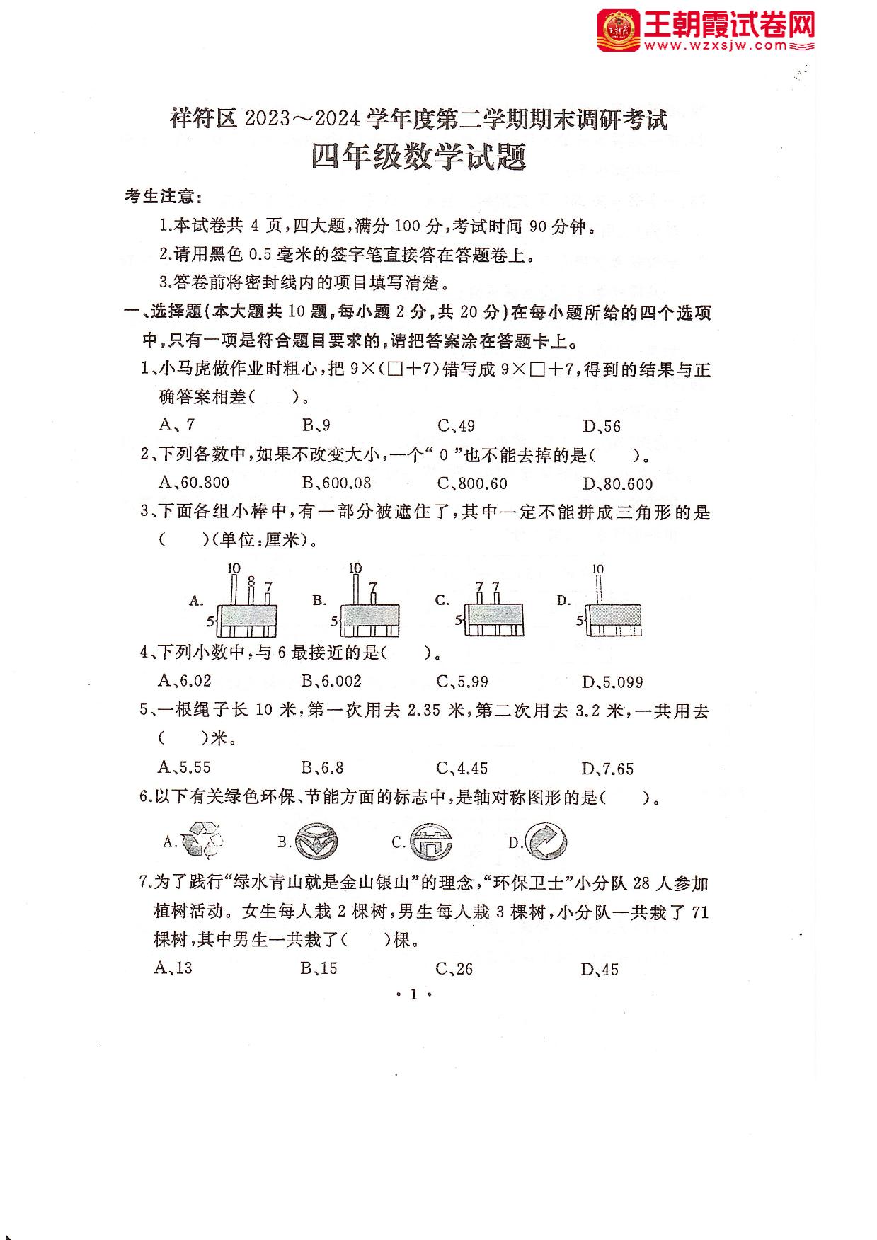 河南省开封市祥符区2023-2024学年度第二学期期末调研考试试题四年级数学(人教版)