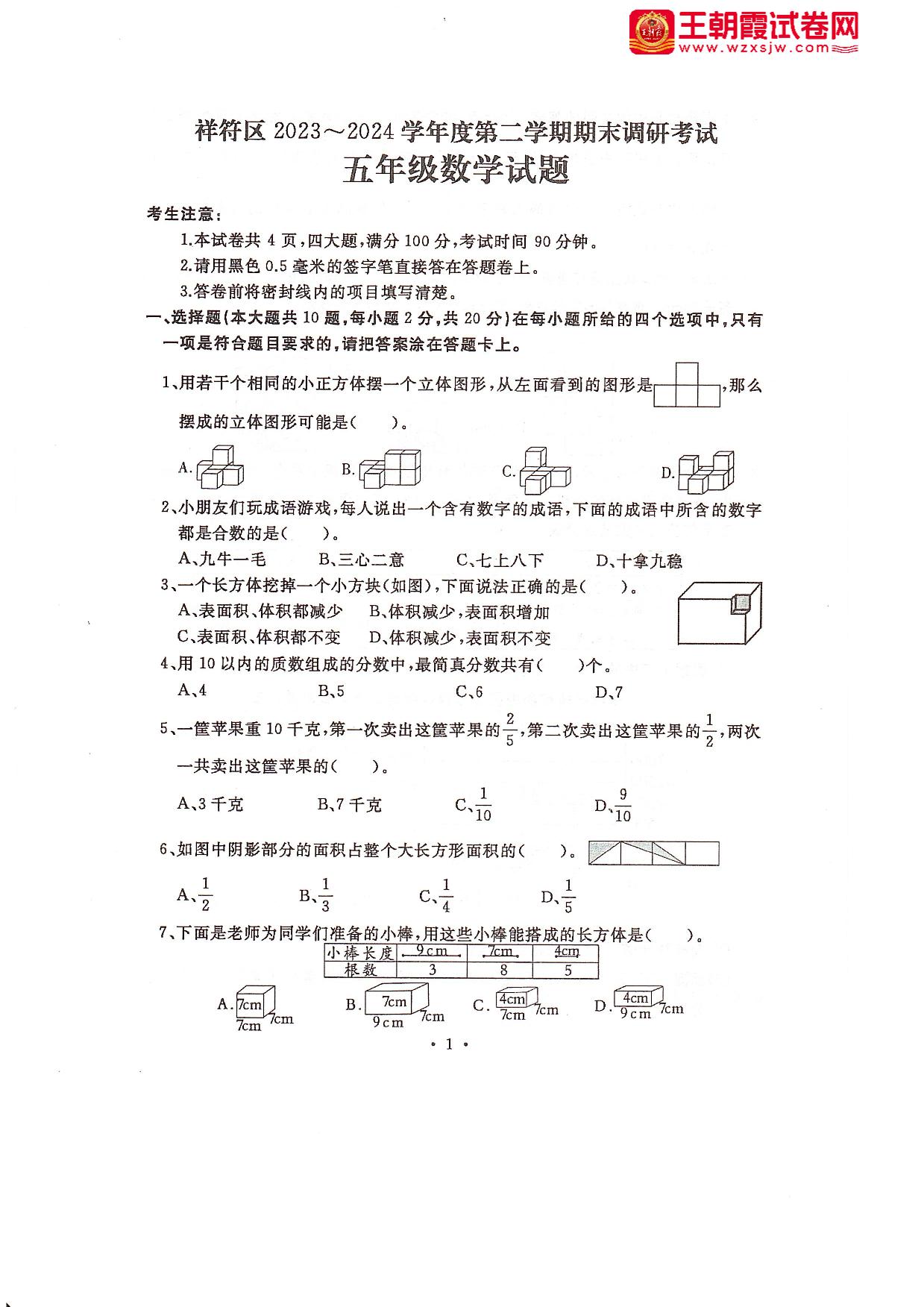 河南省开封市祥符区2023-2024学年度第二学期期末调研考试试题五年级数学(人教版)