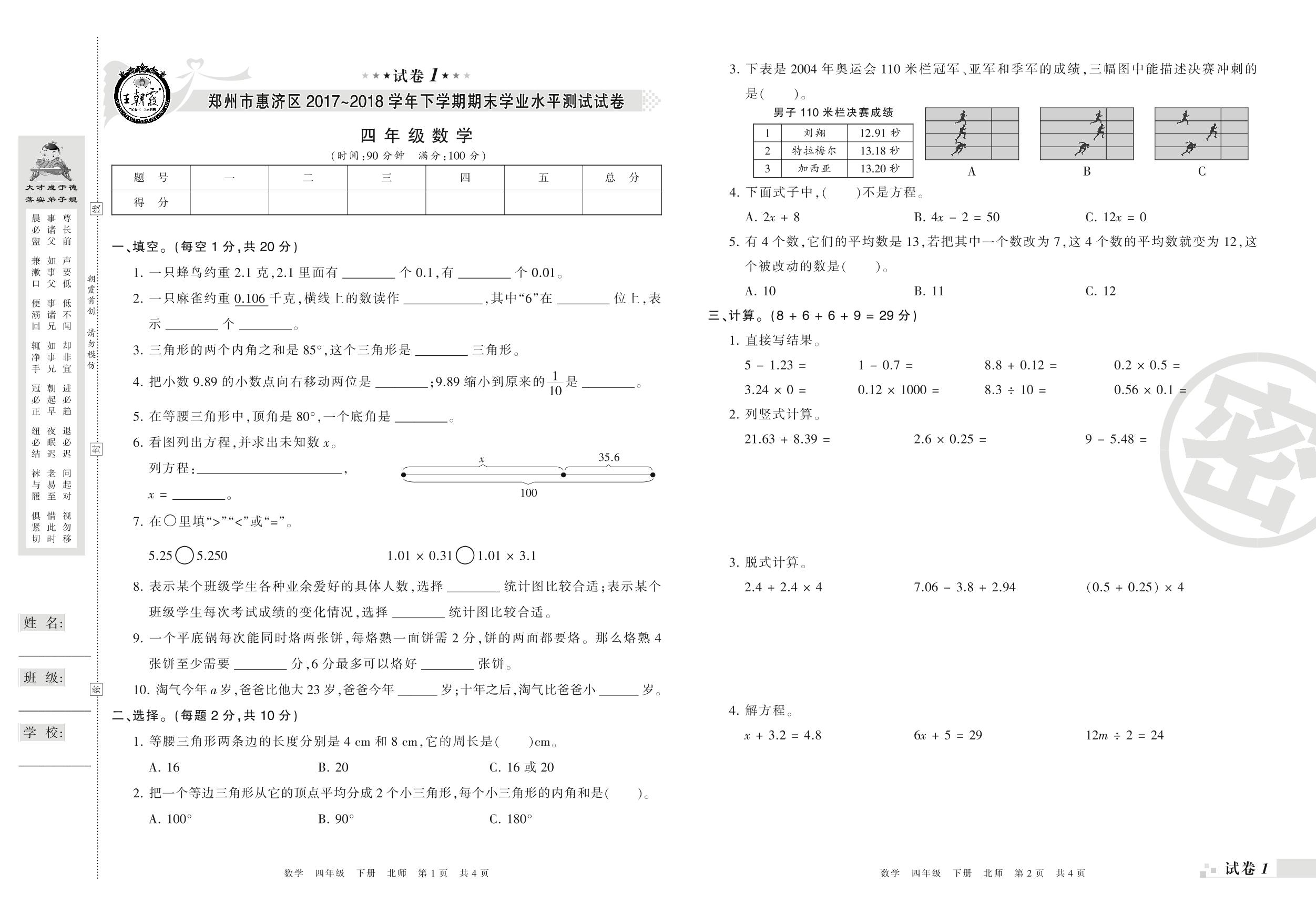 2017-2018学年第二学期郑州市惠济区四年级数学试卷(北师版)【1】