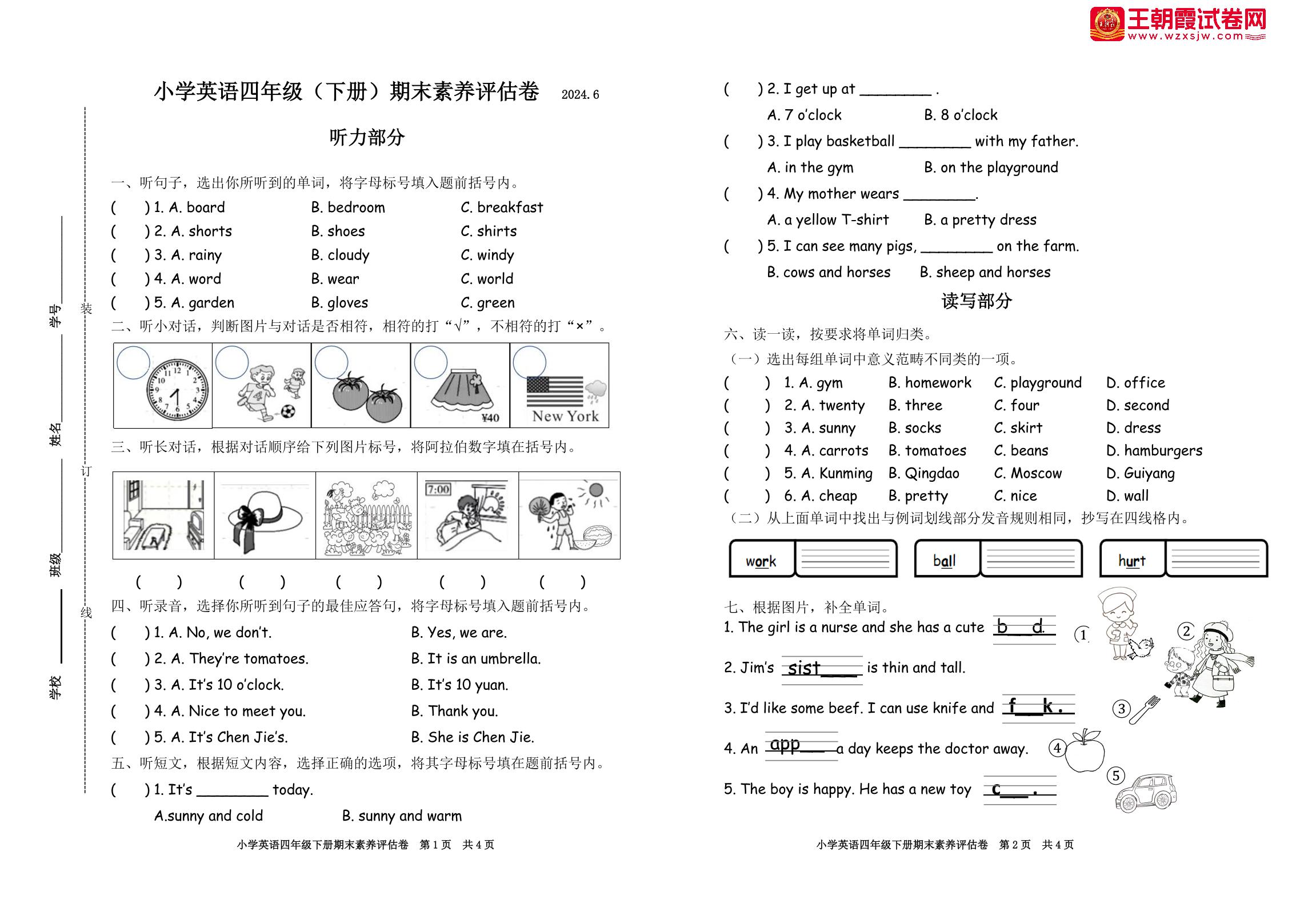 浙江省嘉兴市平湖市2023-2024学年第二学期期末素养监测卷四年级英语(人教PEP版)