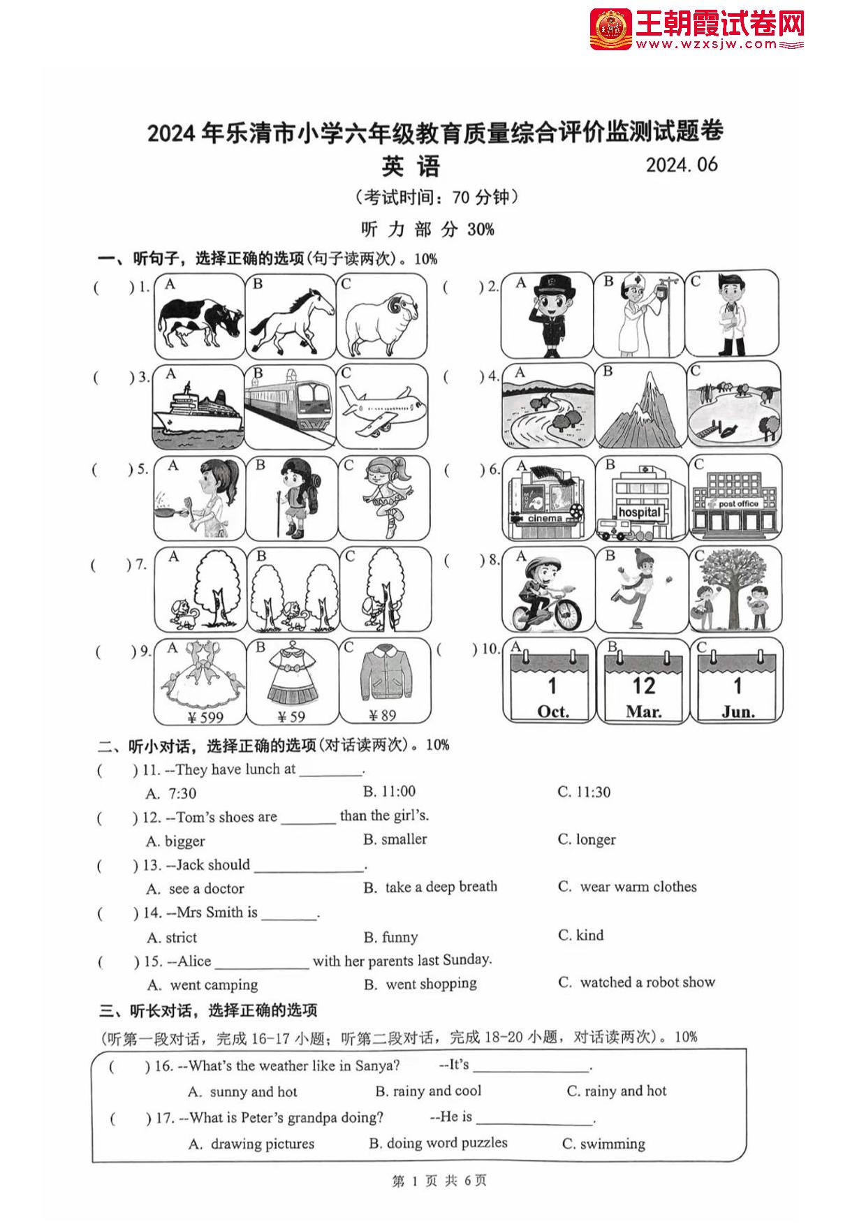 浙江省温州市乐清市2023-2024学年下学期期末教育质量综合评价监测试题卷六年级英语(人教PEP版)