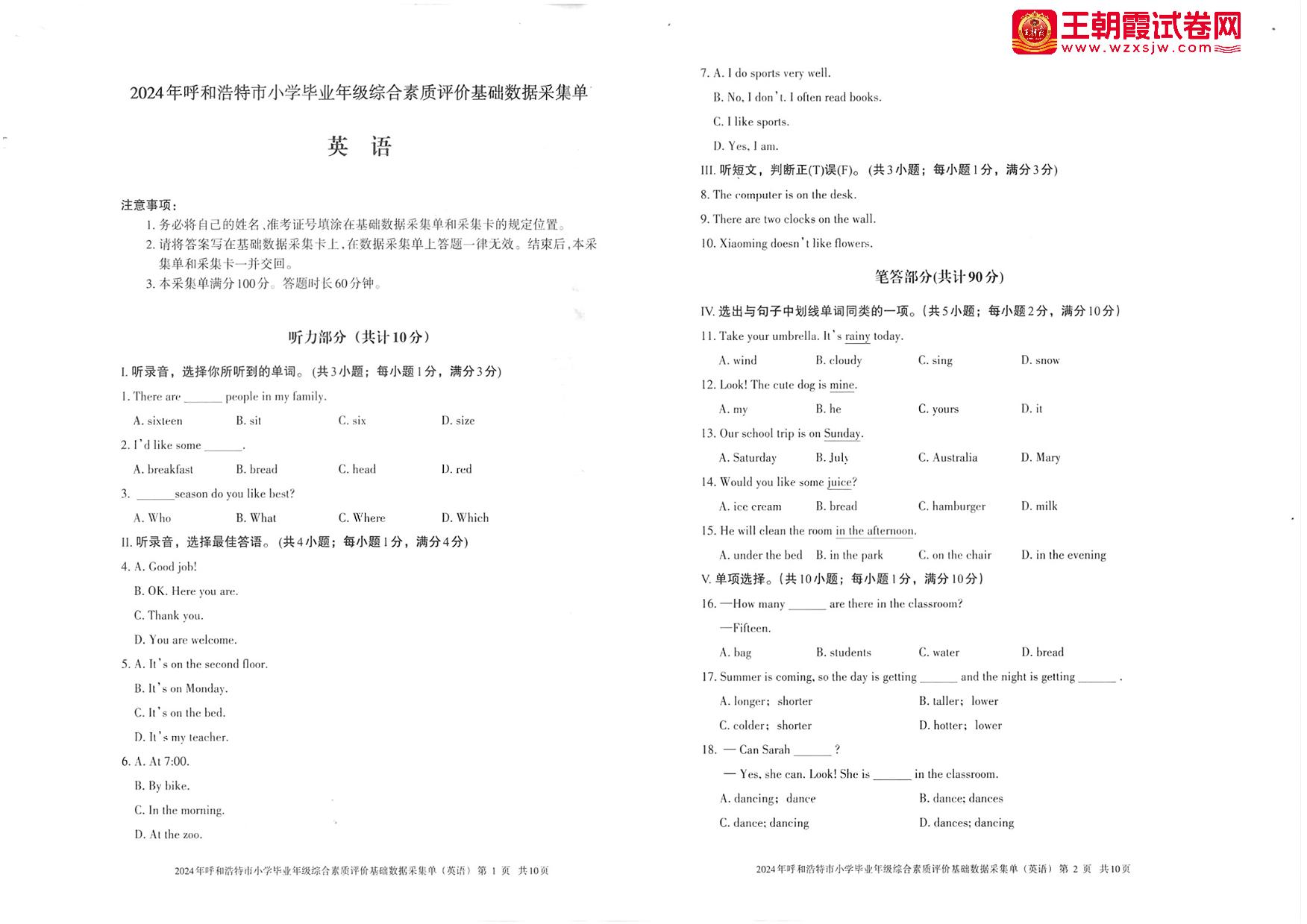 内蒙古自治区呼和浩特市2023-2024学年下学期毕业综合素质评价基础数据采集单六年级英语(人教PEP版)【无听力音频】