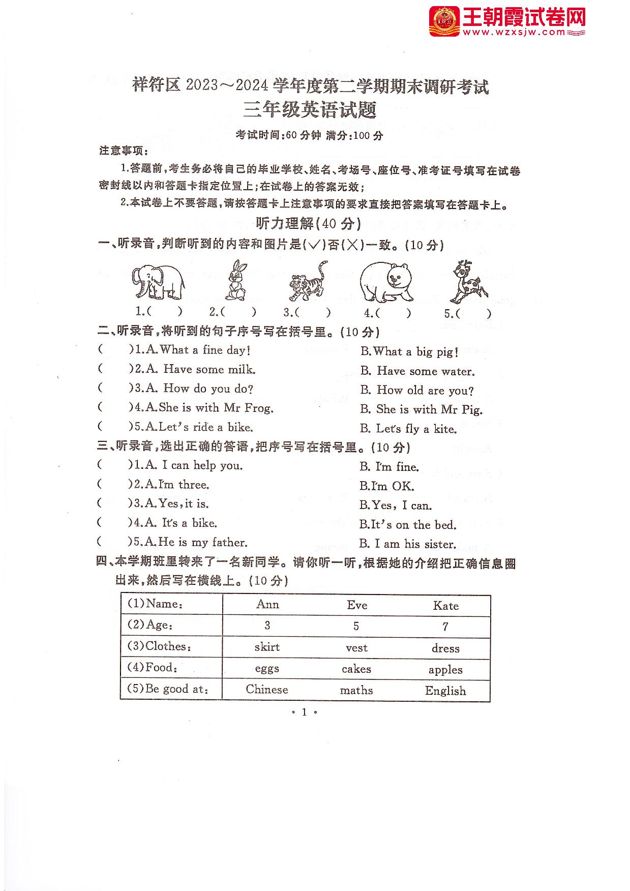 河南省开封市祥符区2023-2024学年度第二学期期末调研考试三年级英语(科普版)【无听力音频】