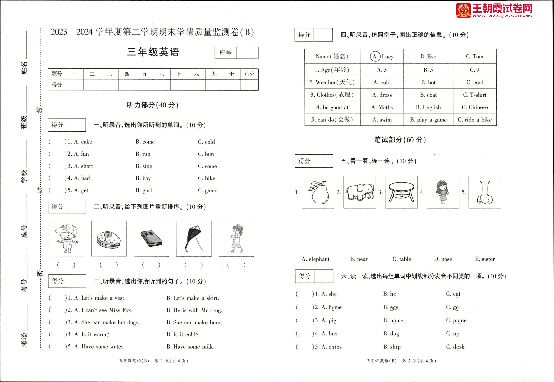 河南省商丘市虞城县2023-2024学年度第二学期期末学情质量监测卷三年级英语(科普版)【无听力音频】