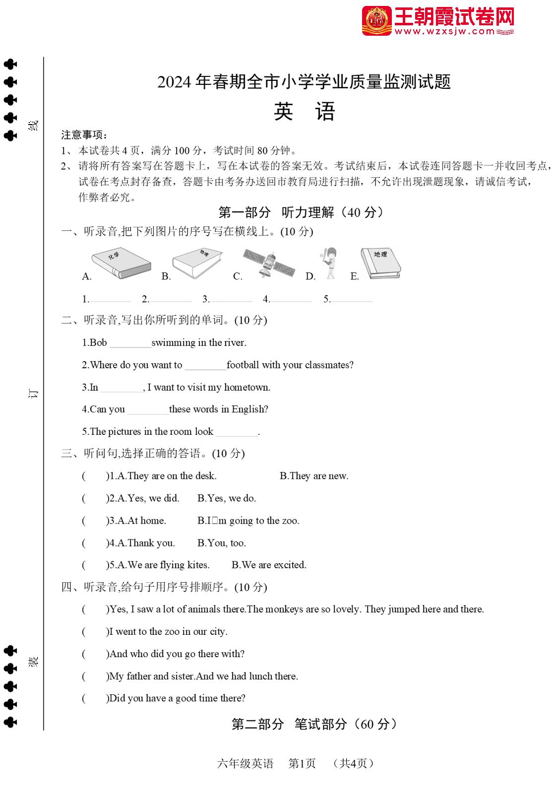 河南省驻马店市2023-2024学年下学期期末学业质量监测六年级英语(科普版)