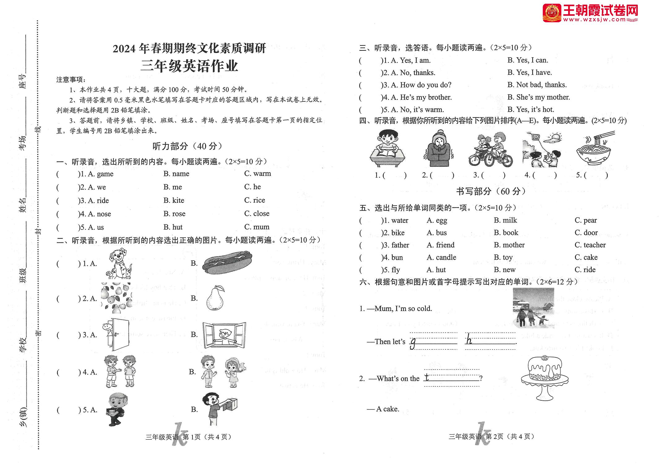 河南省南阳市西峡县2023-2024学年下学期期末文化素质调研三年级英语(科普版)【无听力音频】