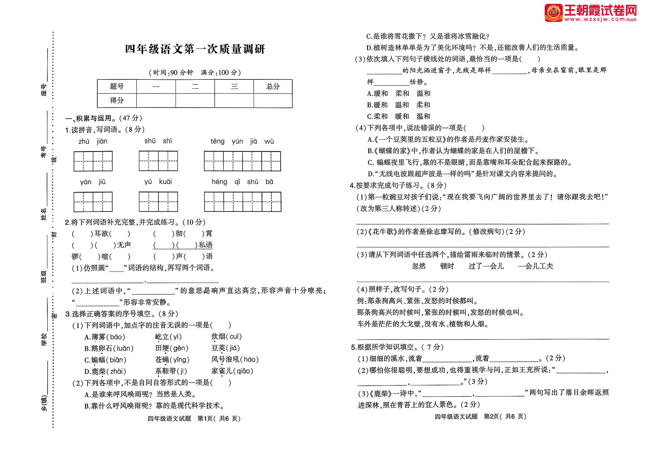 河南省信阳市平桥区2023-2024学年上学期第一次质量调研10月月考四年级语文(人教版)
