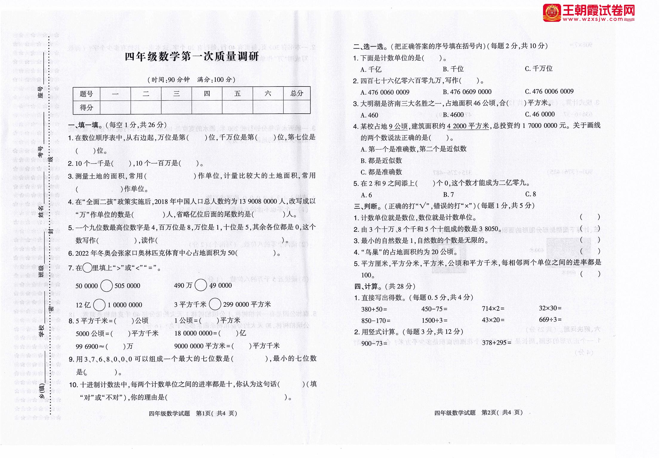 河南省信阳市平桥区2023-2024学年上学期第一次质量调研10月月考四年级数学(人教版)