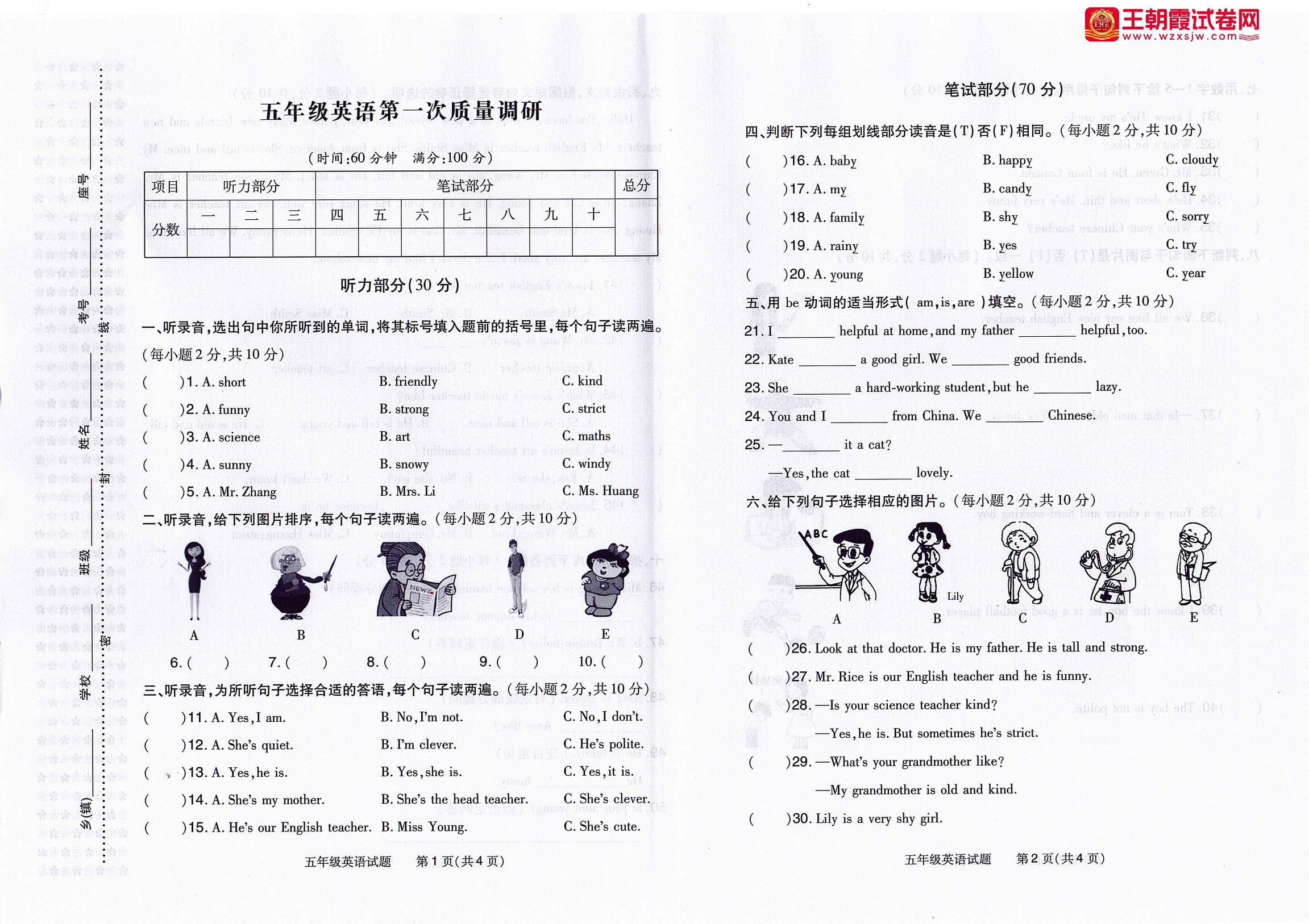 五年级英语人教PEP版(三起始)上册月考卷