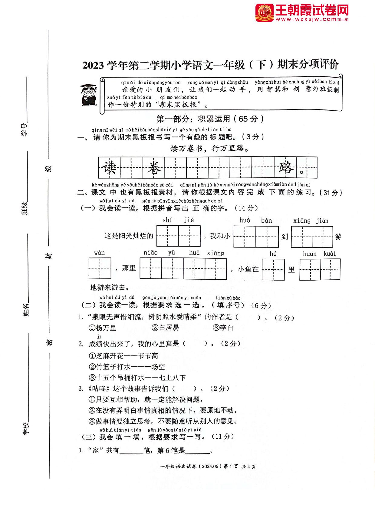 浙江省温州市多校联考2023-2024学年第二学期期末分项评价一年级语文(人教版)