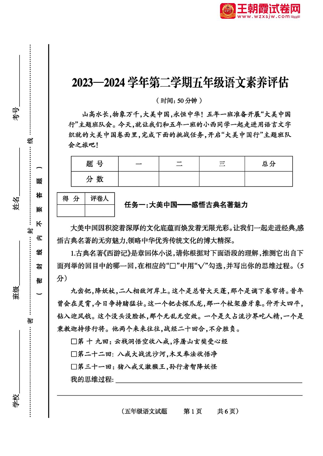 山西省晋城市城区2023-2024学年第二学期期末素养评估试卷五年级语文(人教版)
