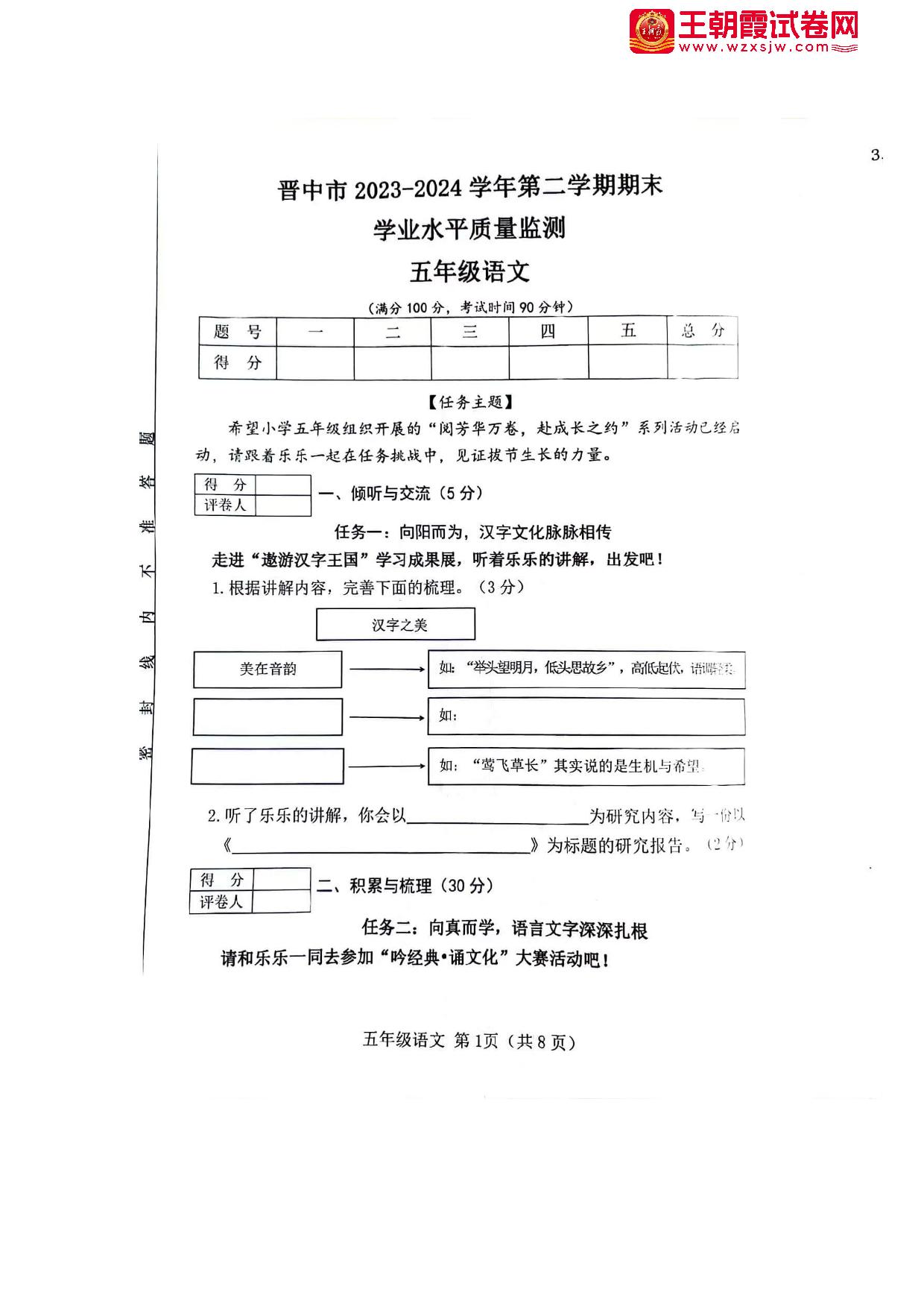 山西省晋中市2023-2024学年第二学期期末学业水平质量检测五年级语文(人教版)
