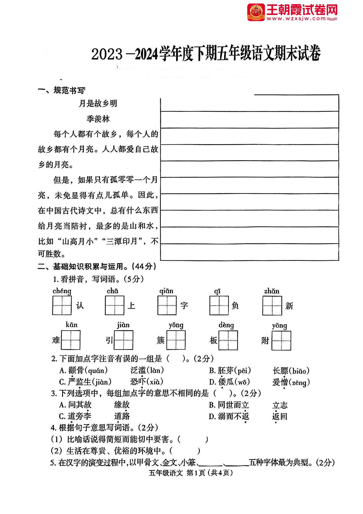 五年级语文人教版下册期末卷