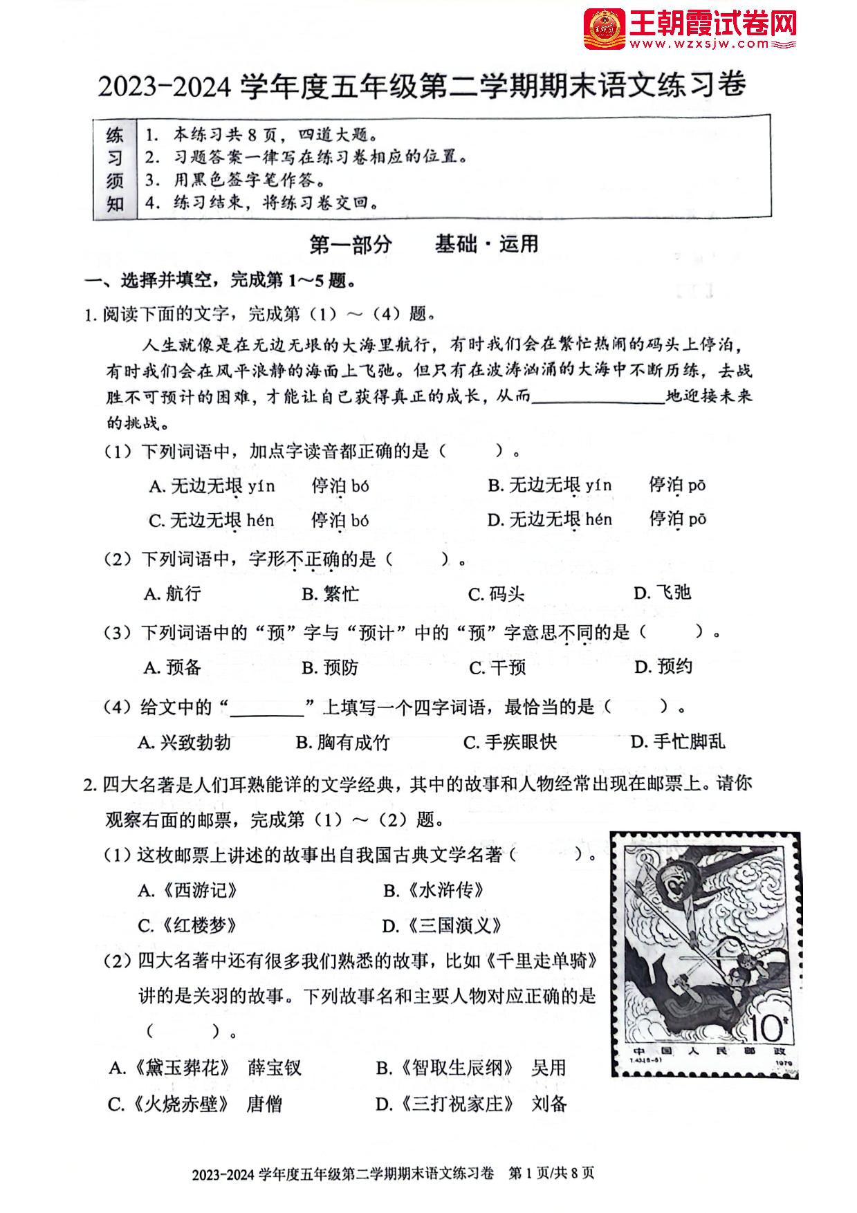 北京市海淀区2023-2024学年度第二学期期末练习卷五年级语文(人教版)