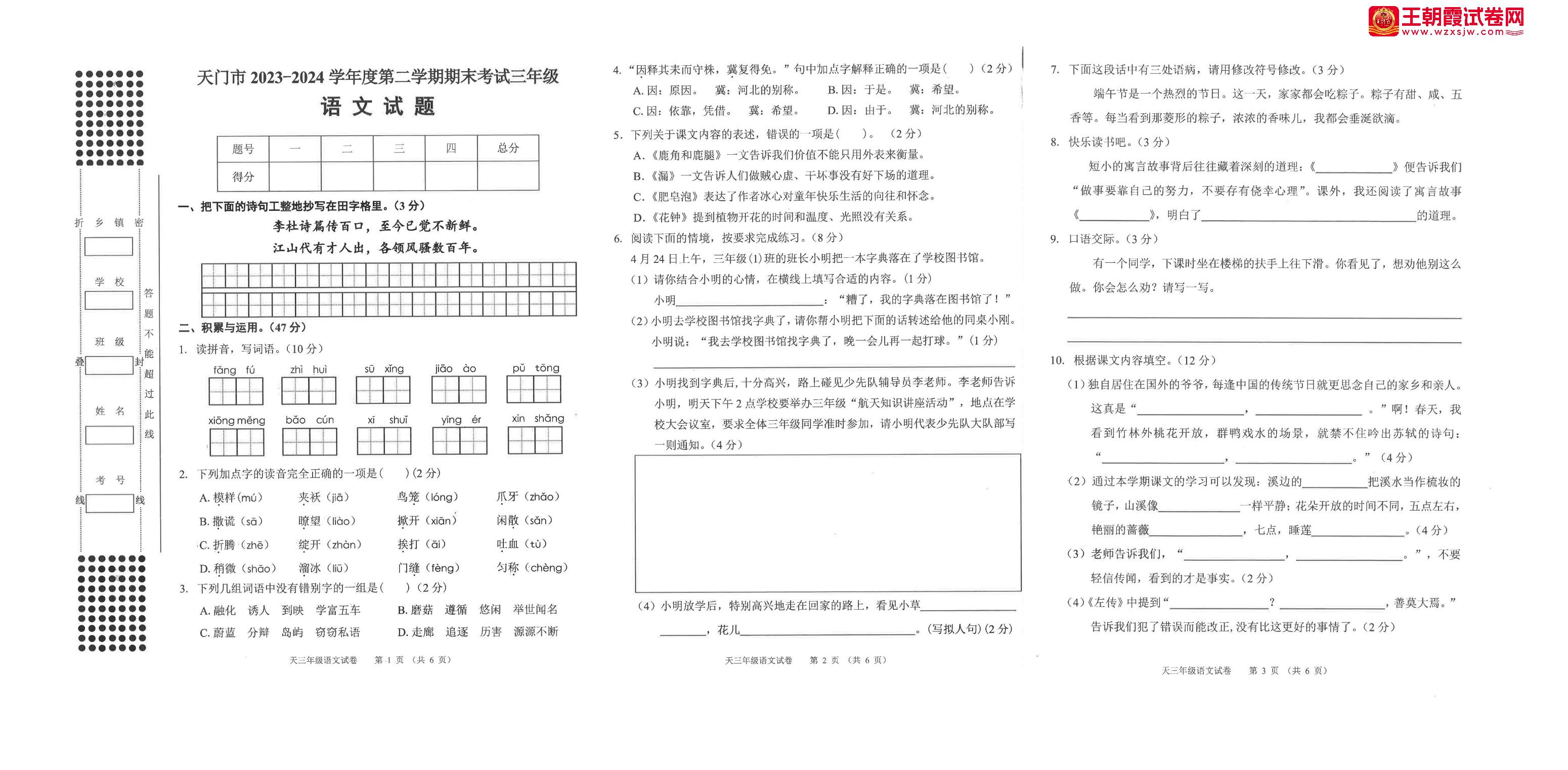 湖北省天门市2023-2024学年度第二学期期末考试三年级语文(人教版)
