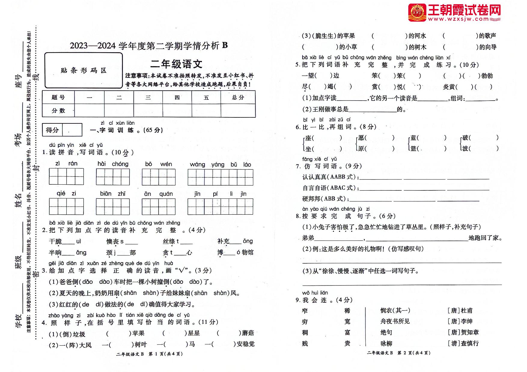 河南省南阳市方城县2023-2024学年度第二学期(期末)学情分析二年级语文(人教版)