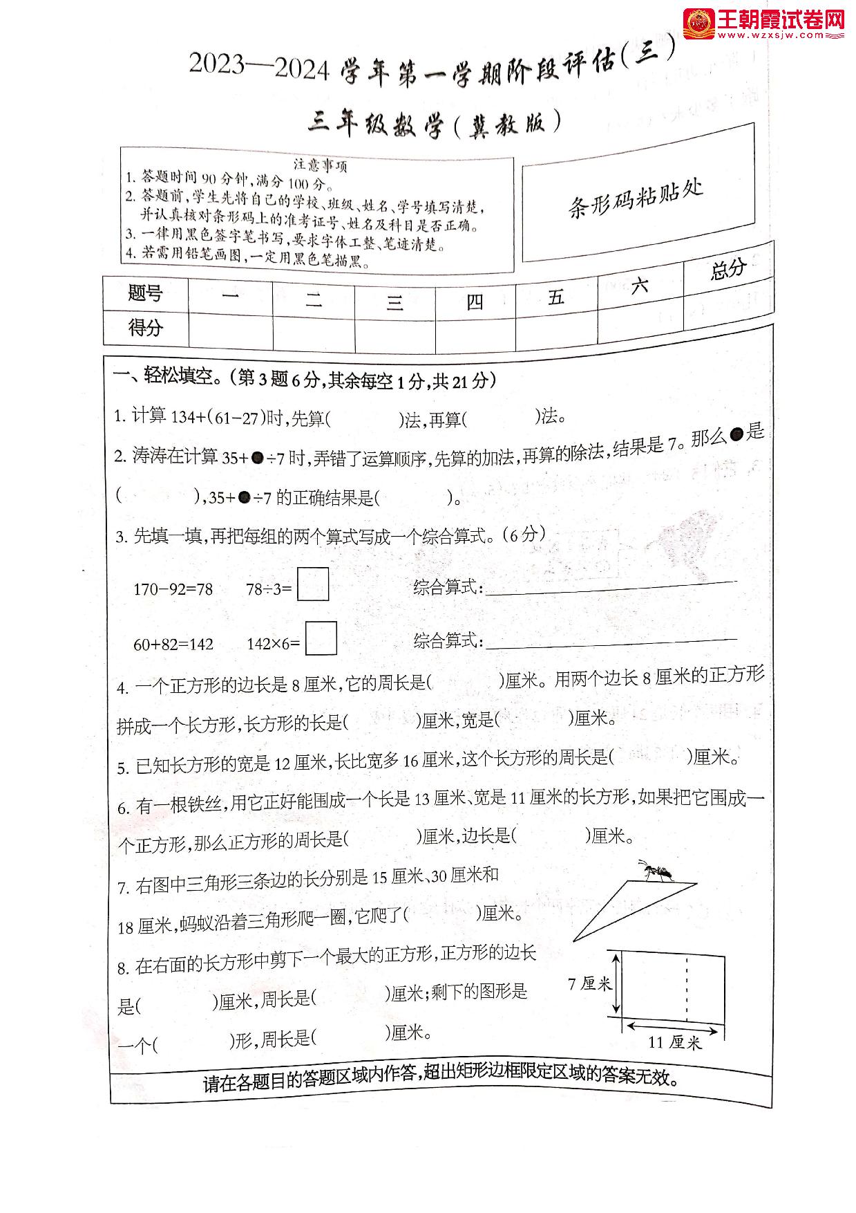 河北省邢台市南和区第二小学2023-2024学年第一学期阶段评估三(月考)三年级数学(冀教版)