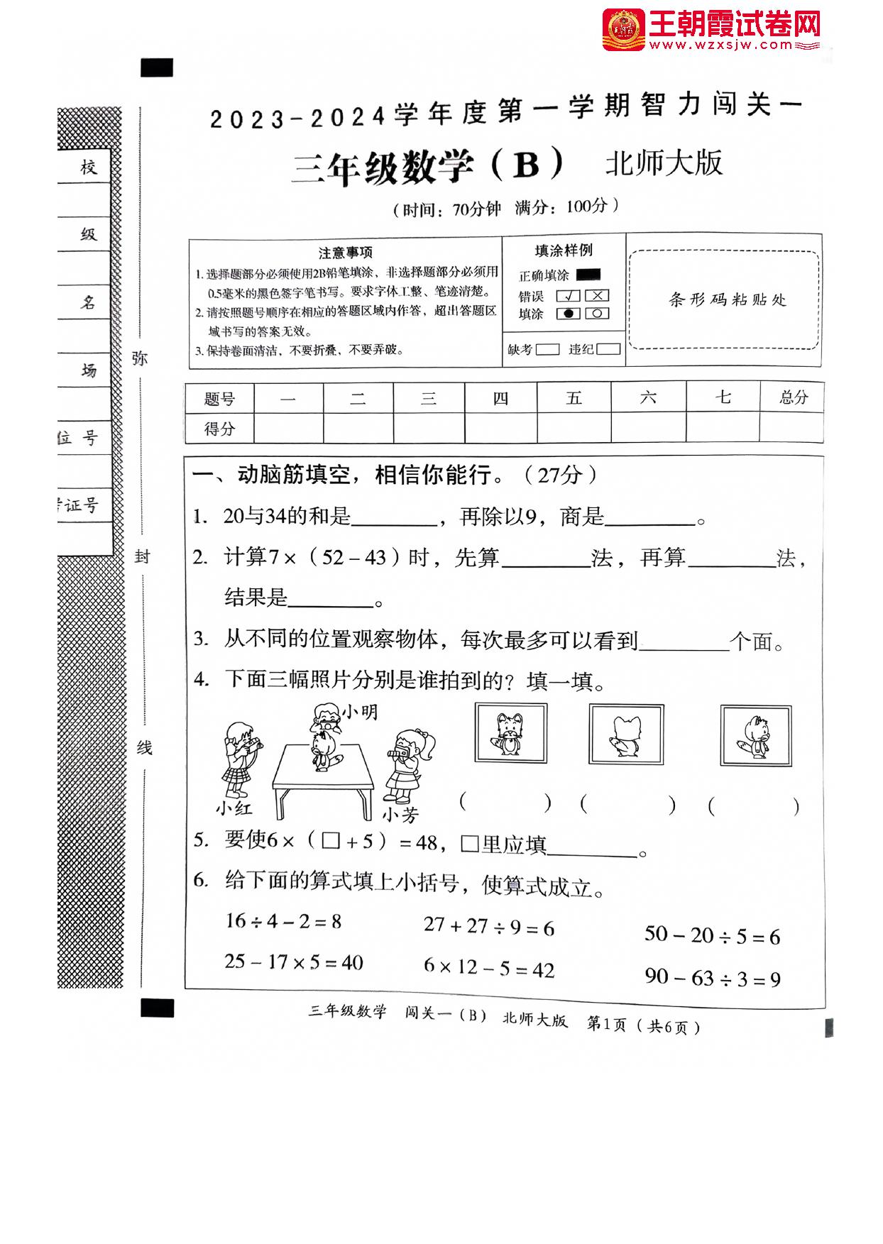 河北省邯郸市临漳县南东坊镇中心校2023-2024学年度第一学期智力闯关一(月考)三年级数学(北师版)