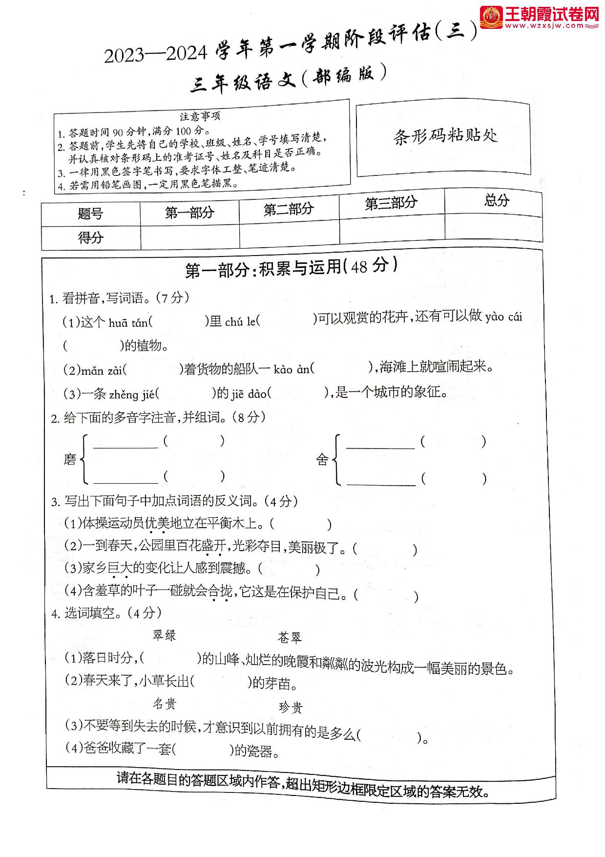 河北省邢台市南和区第二小学2023-2024学年第一学期阶段评估三(月考)三年级语文(人教版)
