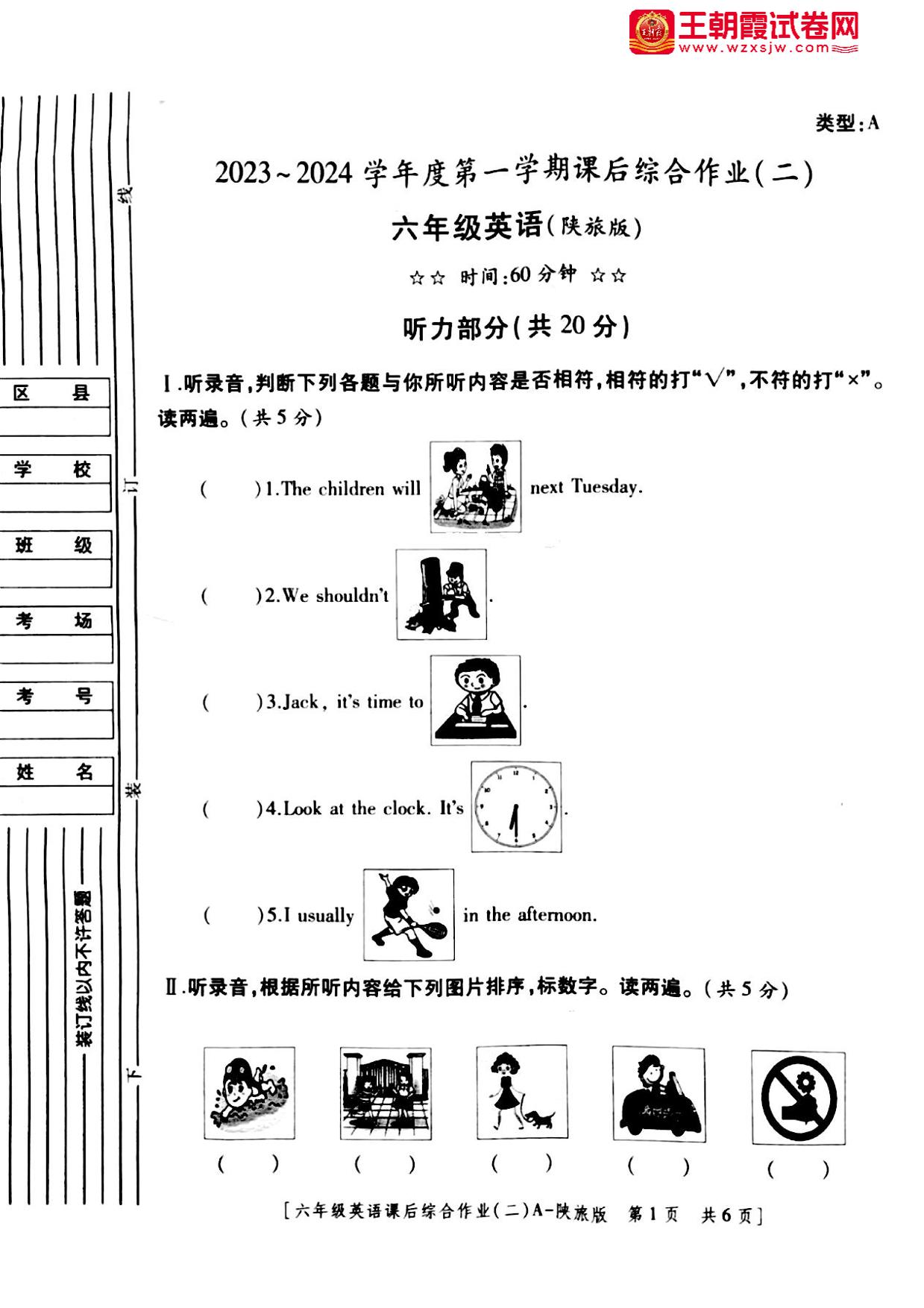 陕西省咸阳市永寿县永太乡余家庄小学2023-2024学年第一学期课后综合作业(二)(期中)六年级英语(陕旅版)