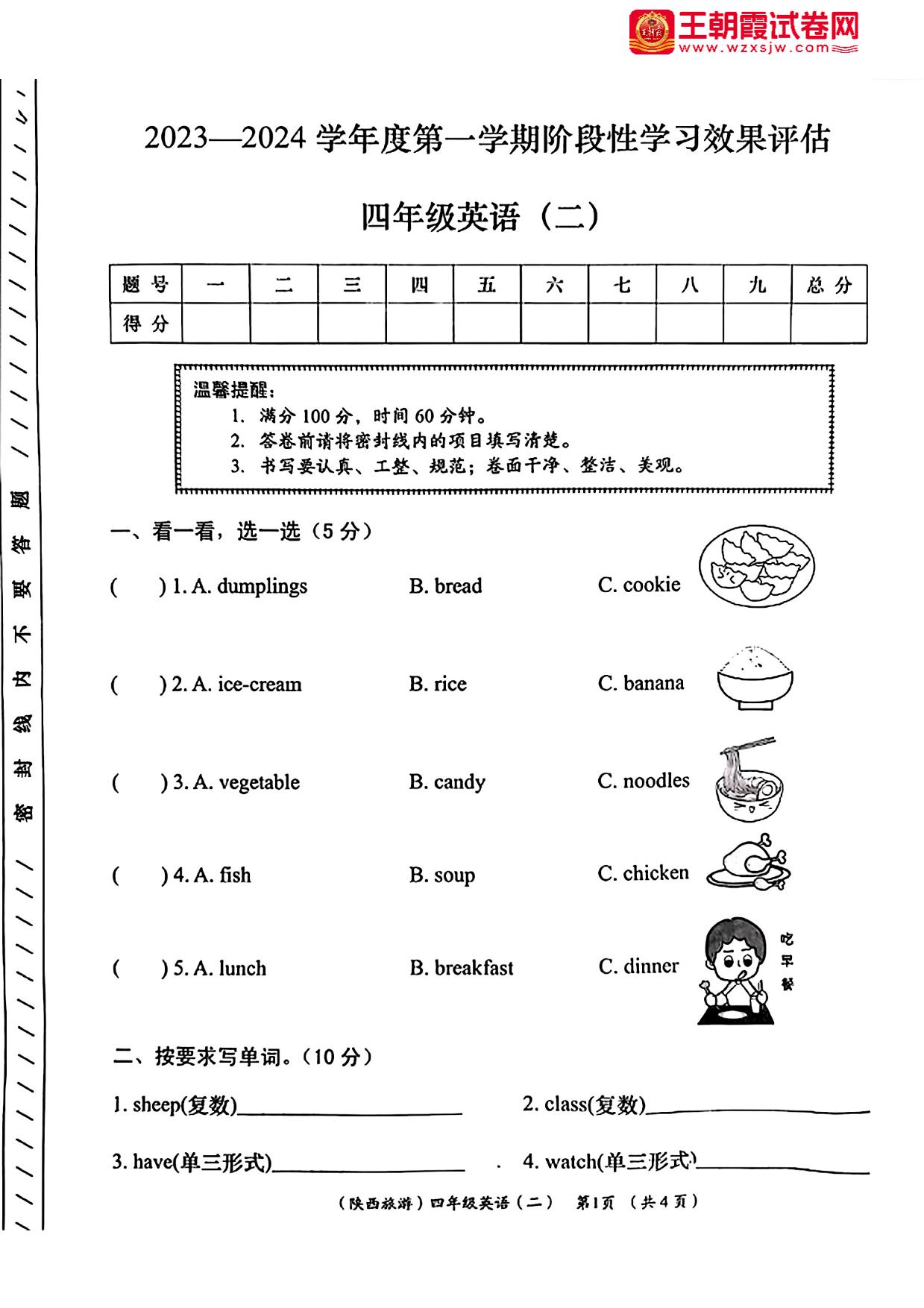 陕西省商洛市山阳县色河铺镇2023-2024学年度第一学期阶段性学习效果评估(期中)四年级英语(陕旅版)
