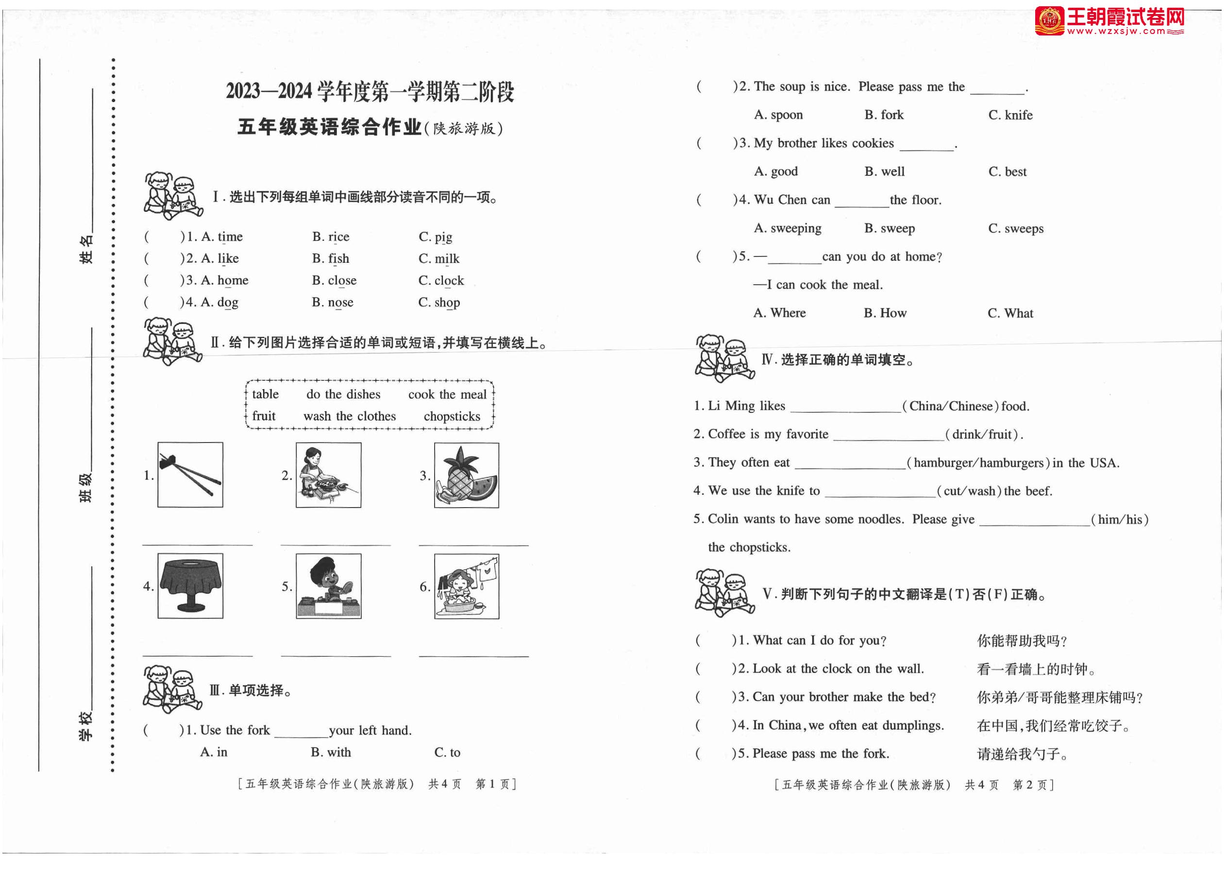 陕西省延安市富县2023-2024学年级第一学期第二阶段综合作业(期中)五年英语(陕旅版)