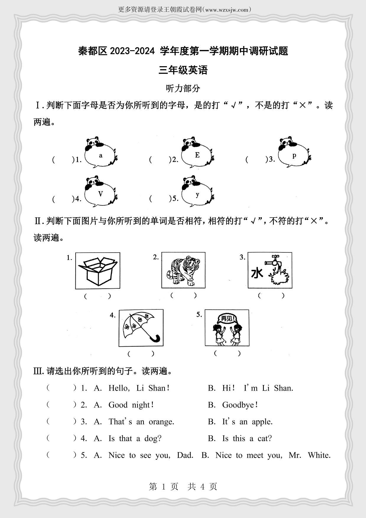 陕西省咸阳市秦都区2023-2024学年第一学期期中调研试题三年级英语(陕旅版)【无听力音频】