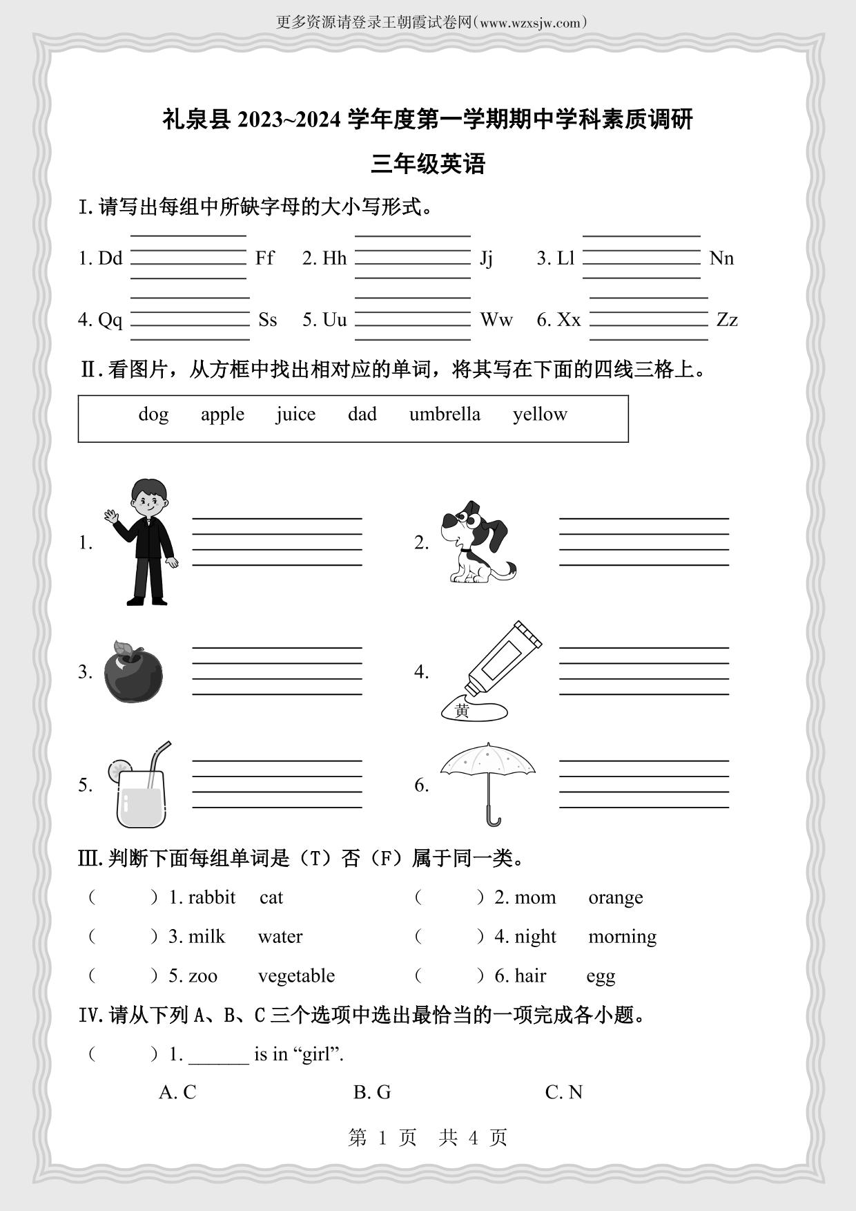 三年级英语陕旅版下册期中卷