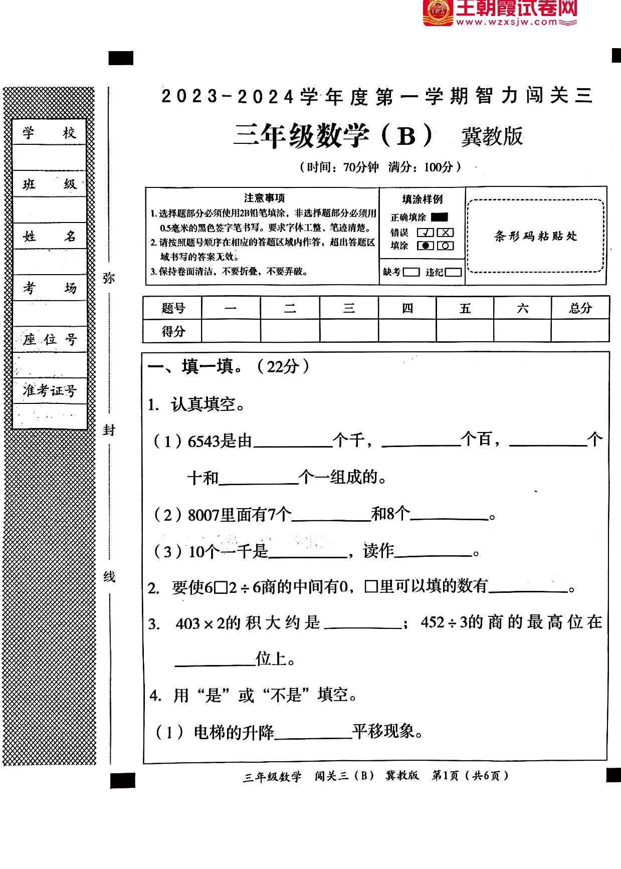 河北省邢台市威县第四小学2023-2024学年度第一学期智力闯关三(月考)三年级数学(冀教版)